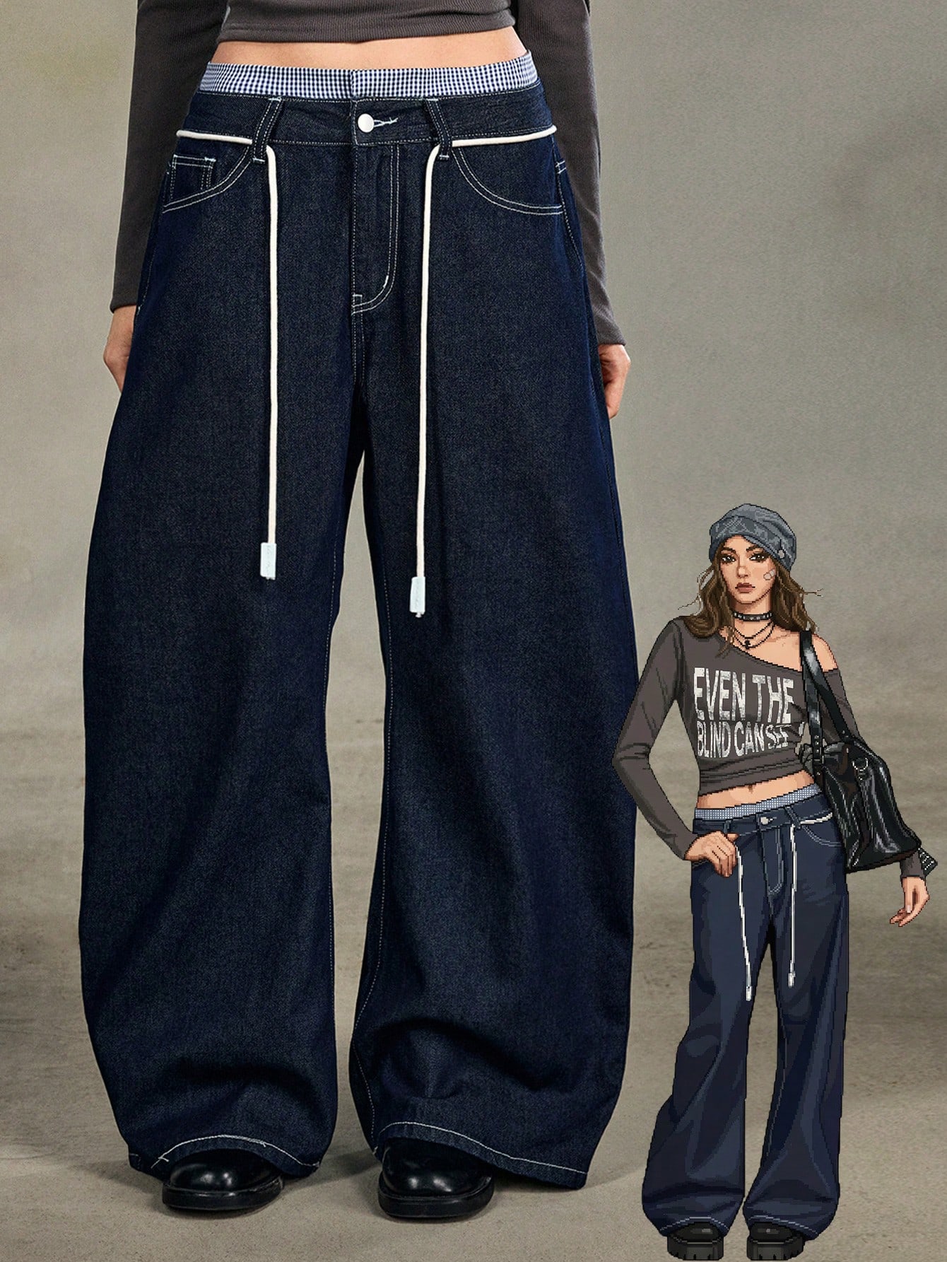 Grunge Punk Jeans évasés avec design de double ceinture taille, patchwork vintage chic casual à carreaux