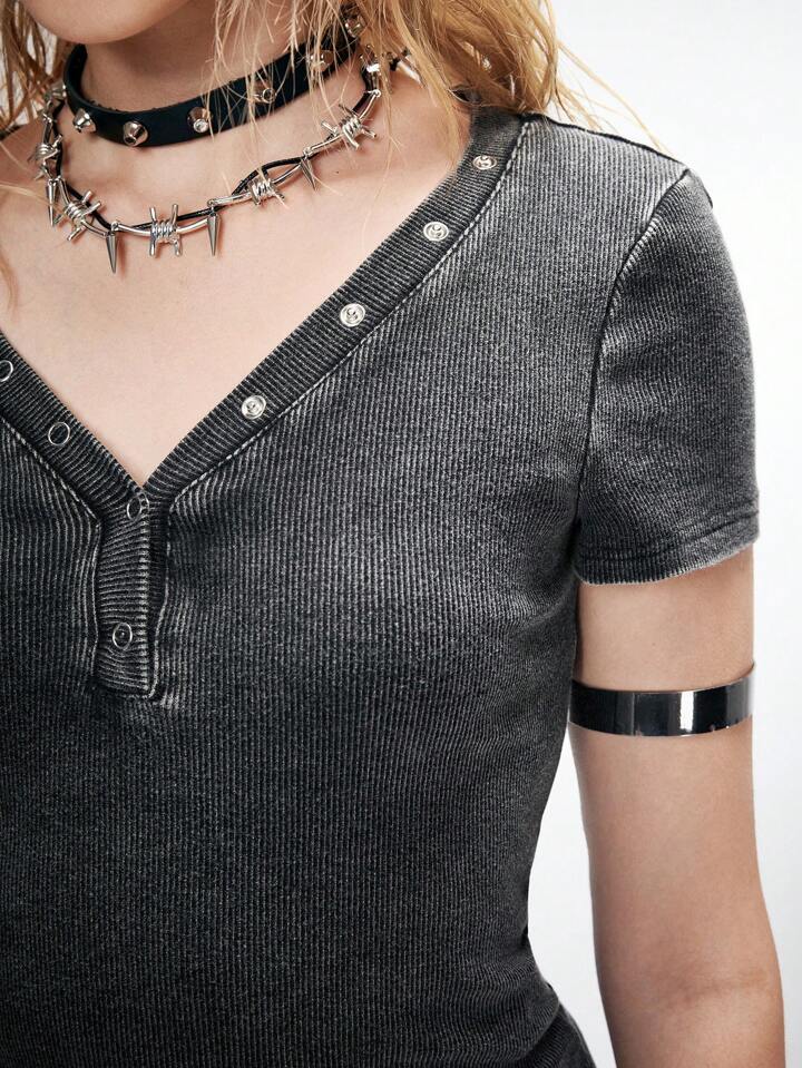 Grunge Punk T-shirt femme vintage mélangé à manches courtes noir et gris avec poches œilletées délavées, style rétro col bas. Convient pour l'été, la plage, la remise des diplômes, Pâques, les concerts, les vacances à Nashville