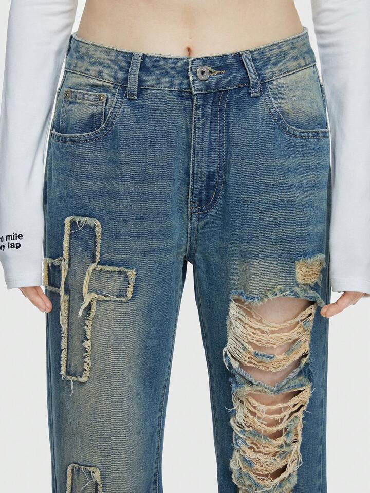 Grunge Punk Pantalon En Jean Déchiré Avec Broderie En Patchwork Croisé Punk Pour Femme, Style Streetwear