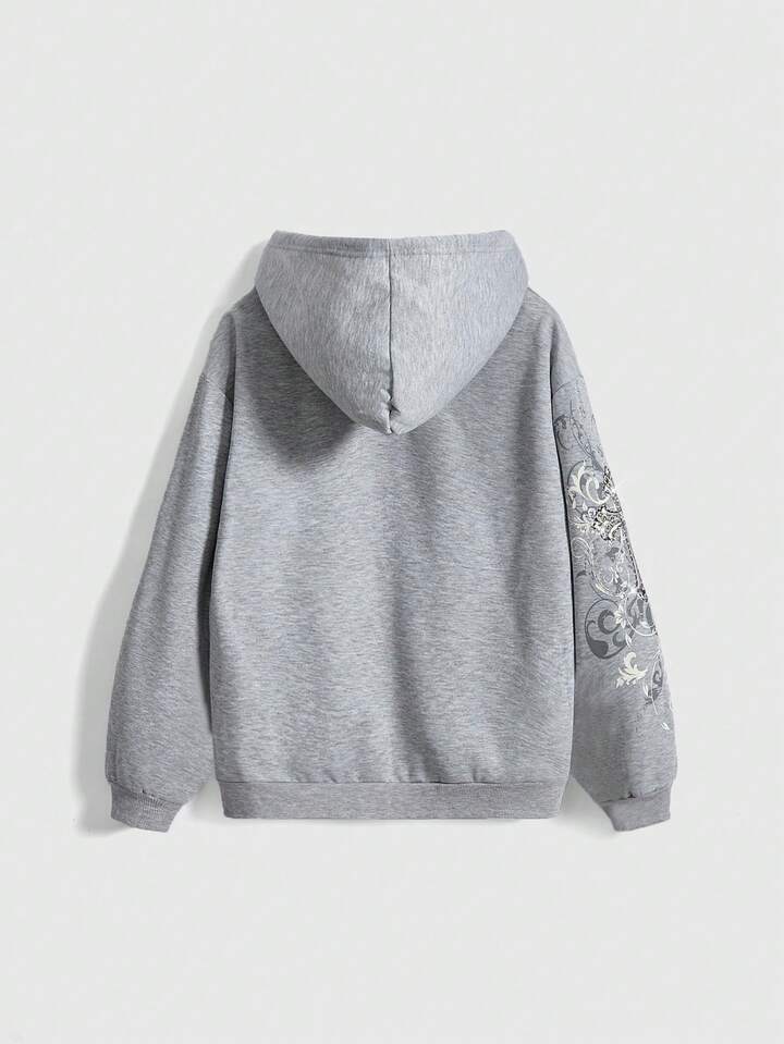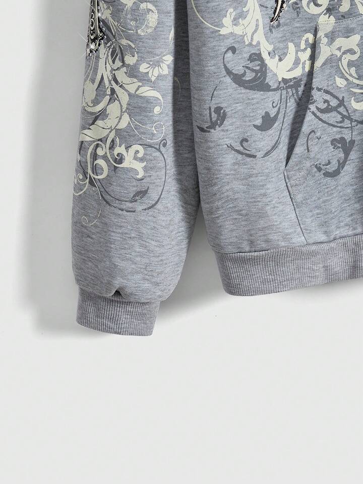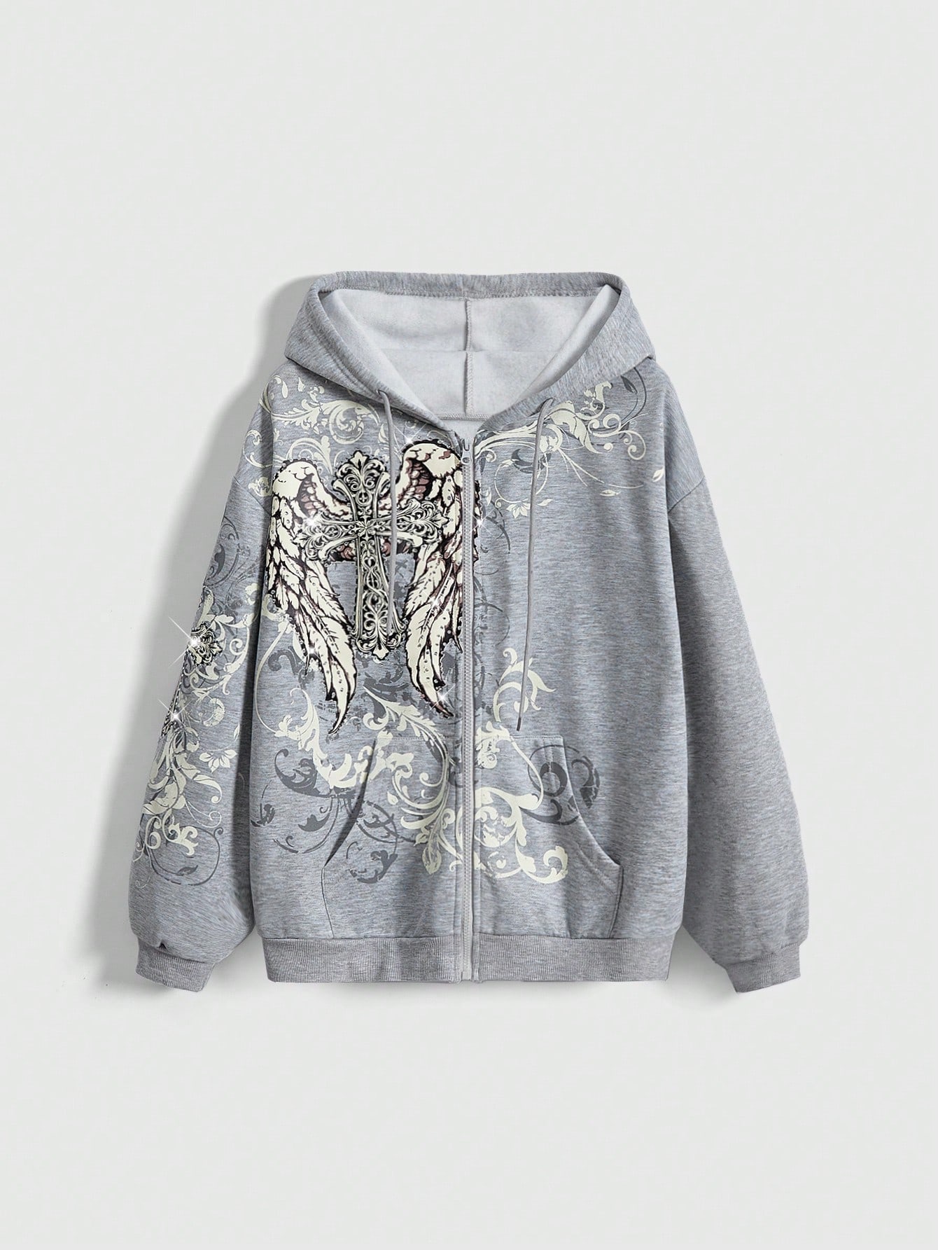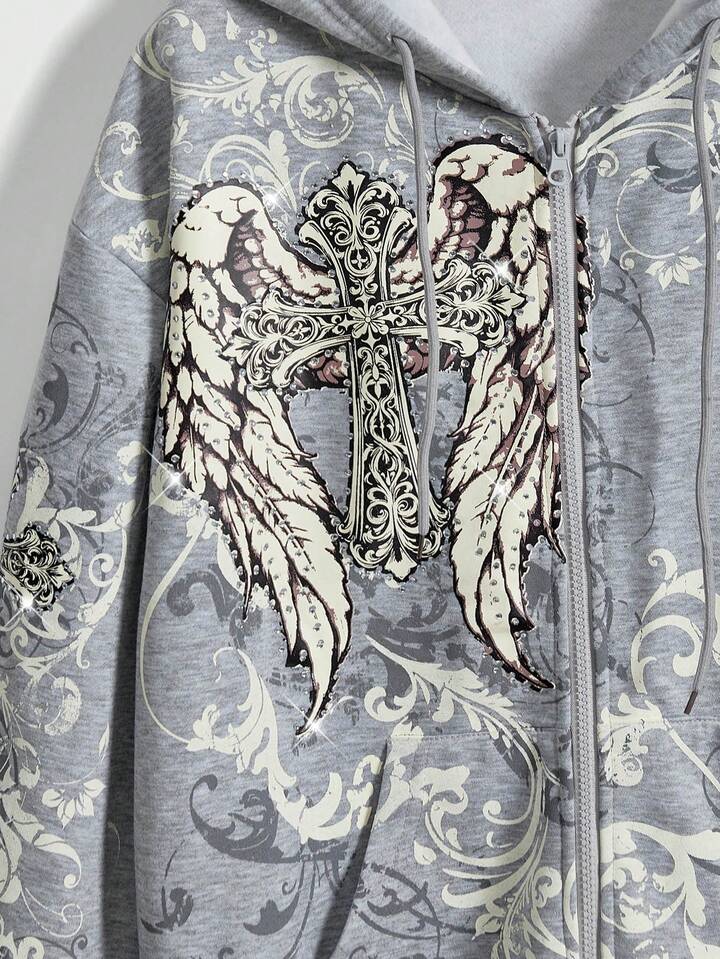 Grunge Punk sweat-shirt à capuche pour femmes avec imprimé croix et ailes, orné de strass