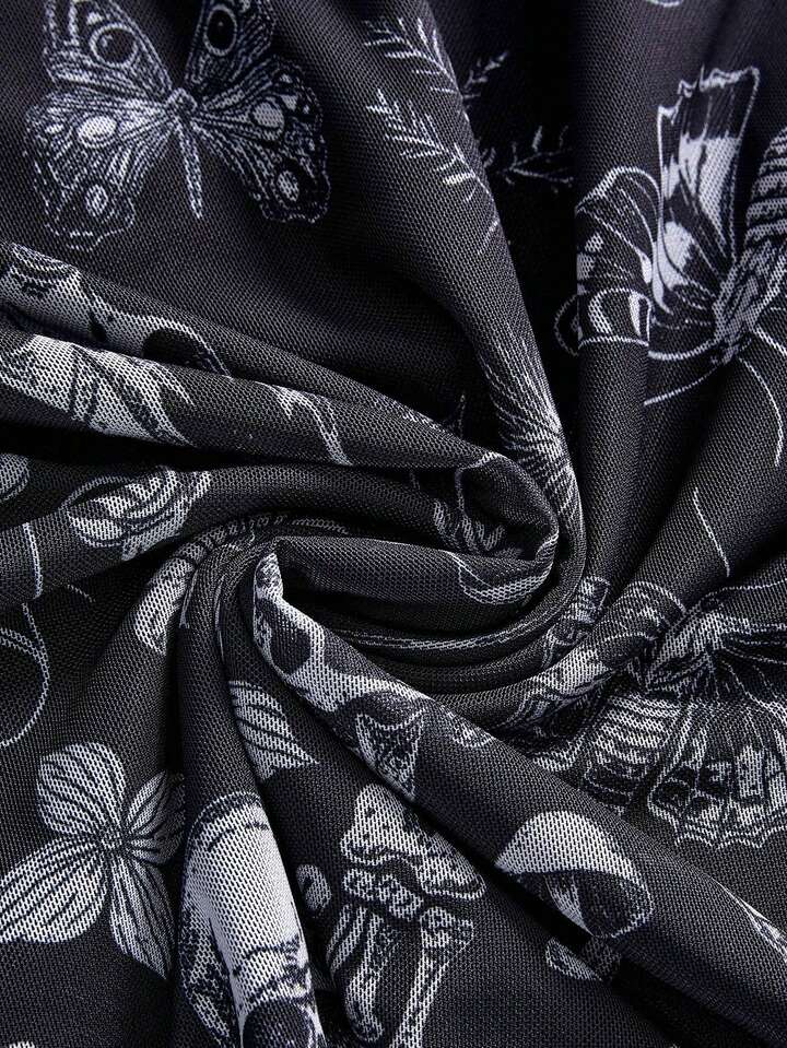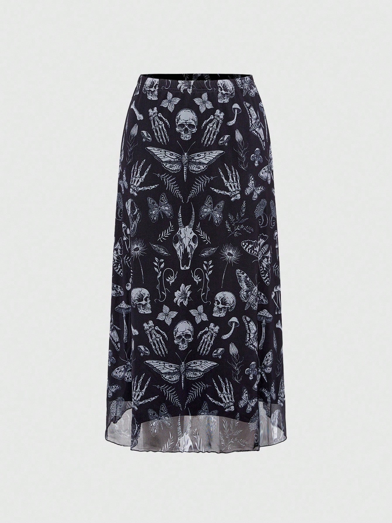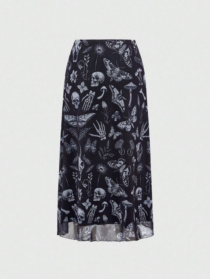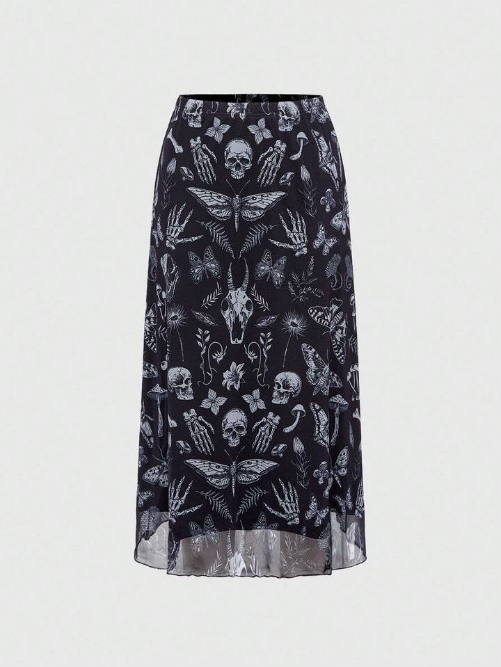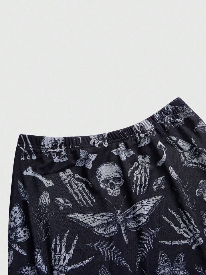 Grunge Punk Jupe mini punk évasée pour femmes avec imprimé gothique sombre de chauve-souris, crâne, lune et citrouille
