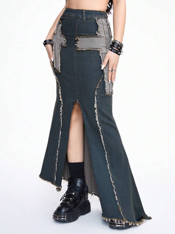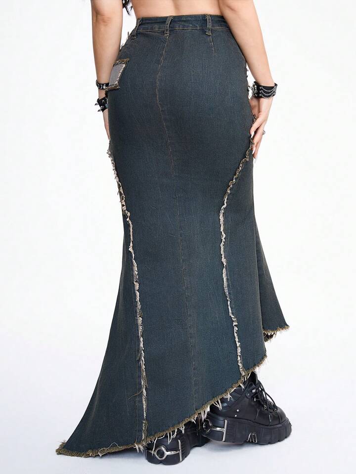Grunge Punk Jupe en denim à la mode pour femmes avec ourlet effiloché et fente