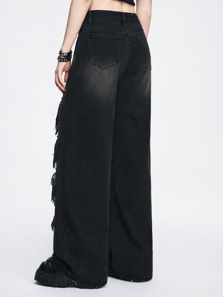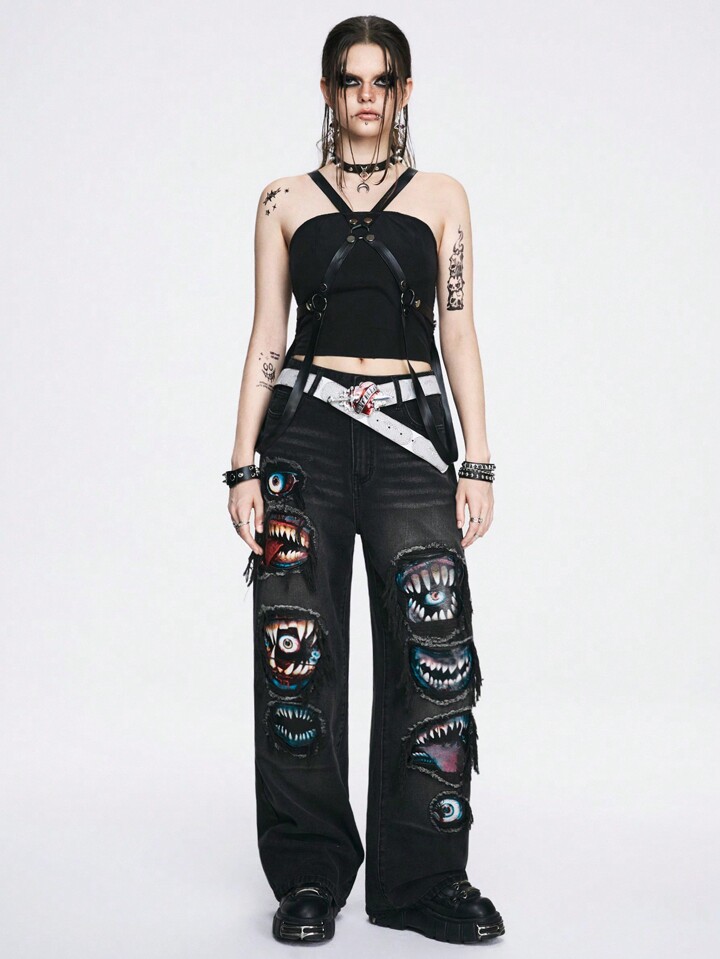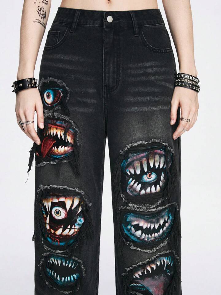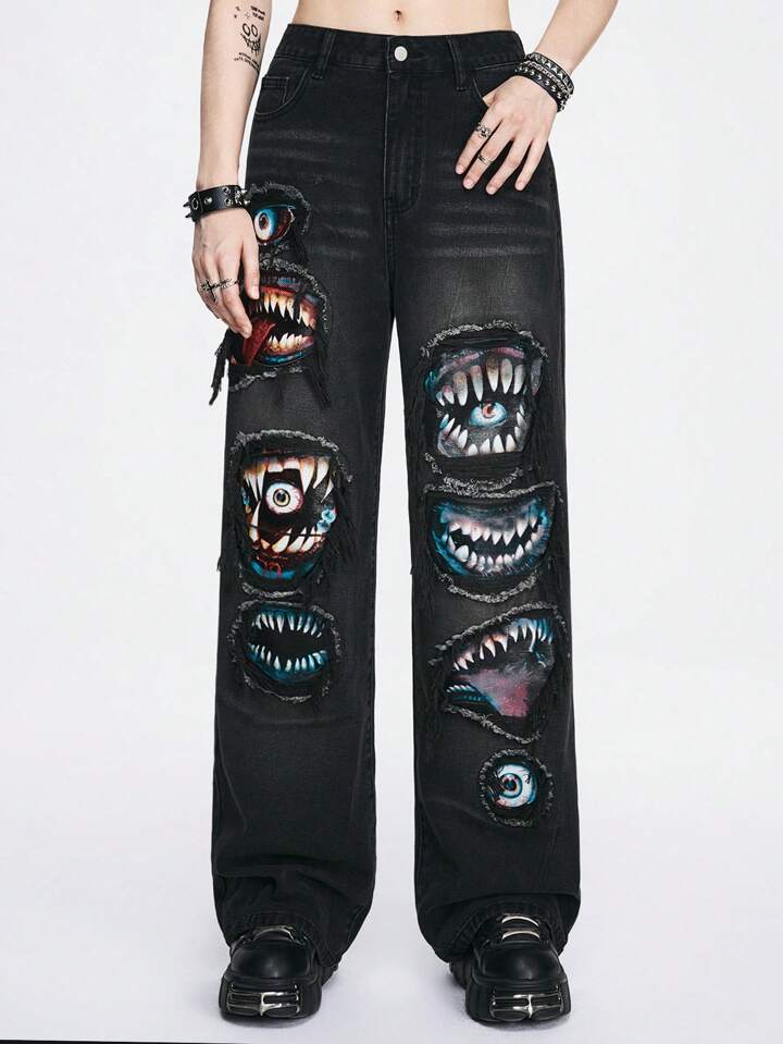 Grunge Punk Jeans droits décontractés et amples avec poches imprimées de monstre, pour l'école