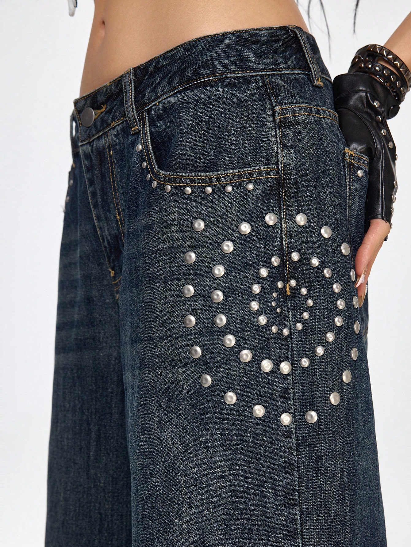 Grunge Punk Jeans évasés pour femmes avec poches, boutons, rivets et lavage vintage délavé, idéaux pour le trajet domicile-travail