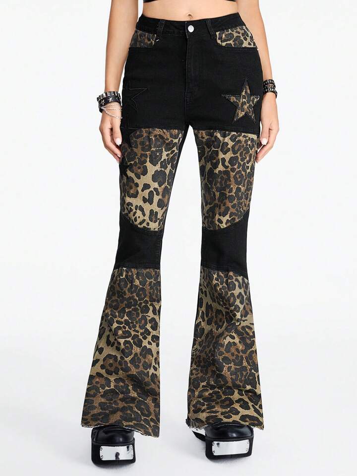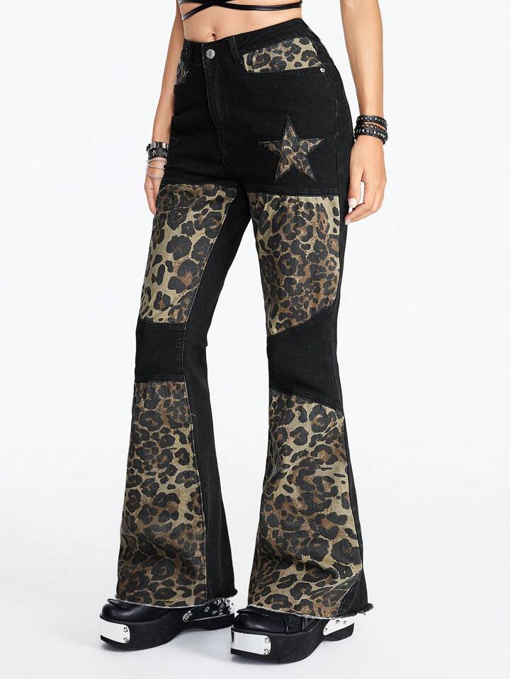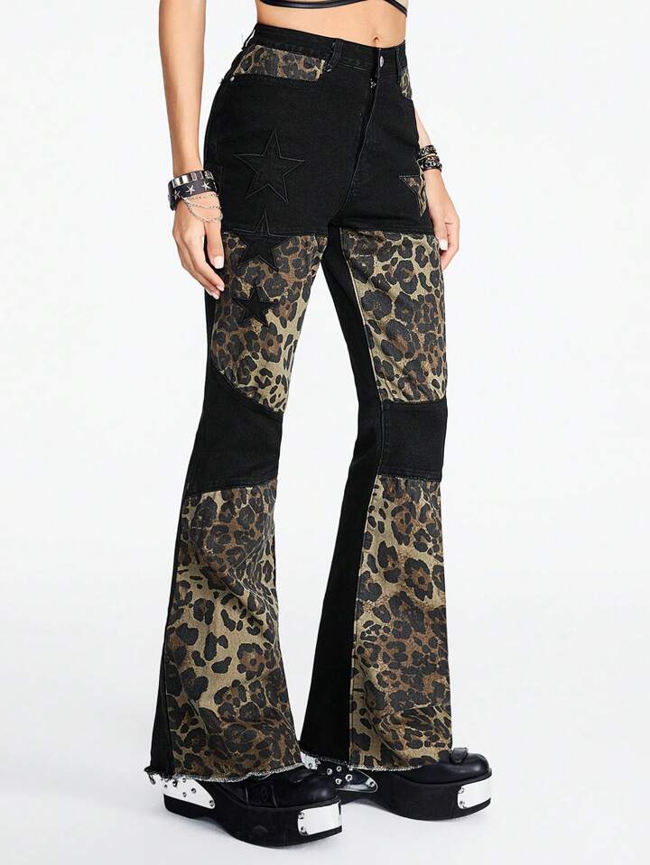 Grunge Punk Jeans en denim à patchwork de style punk avec imprimé étoile et léopard pour femmes