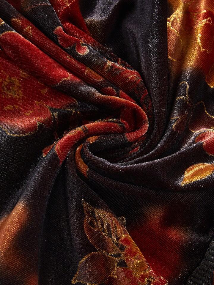 Grunge Punk Jupe évasée à imprimé floral avec taille nouée, ourlet à franges en velours métallique de style rétro hippie de luxe pour femmes