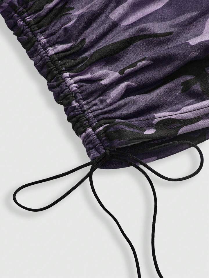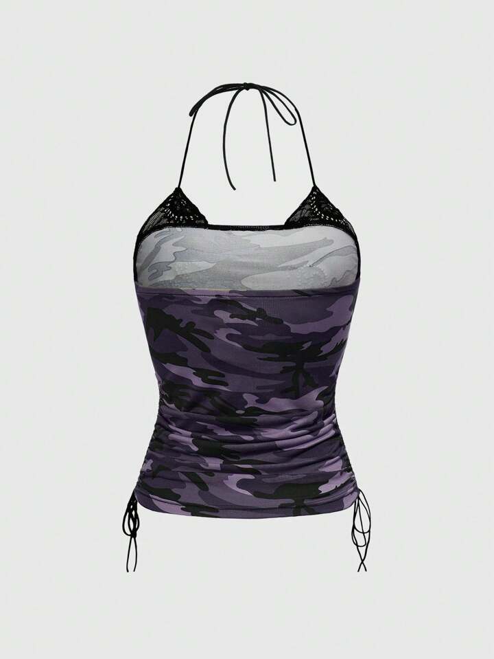 Grunge Punk Top court à encolure ras-du-cou, patchwork de camouflage et de dentelle rétro sexy avec strass, pour l'été