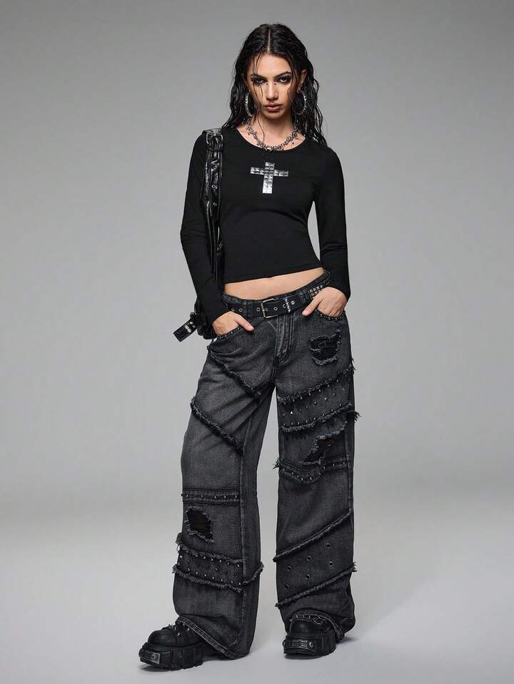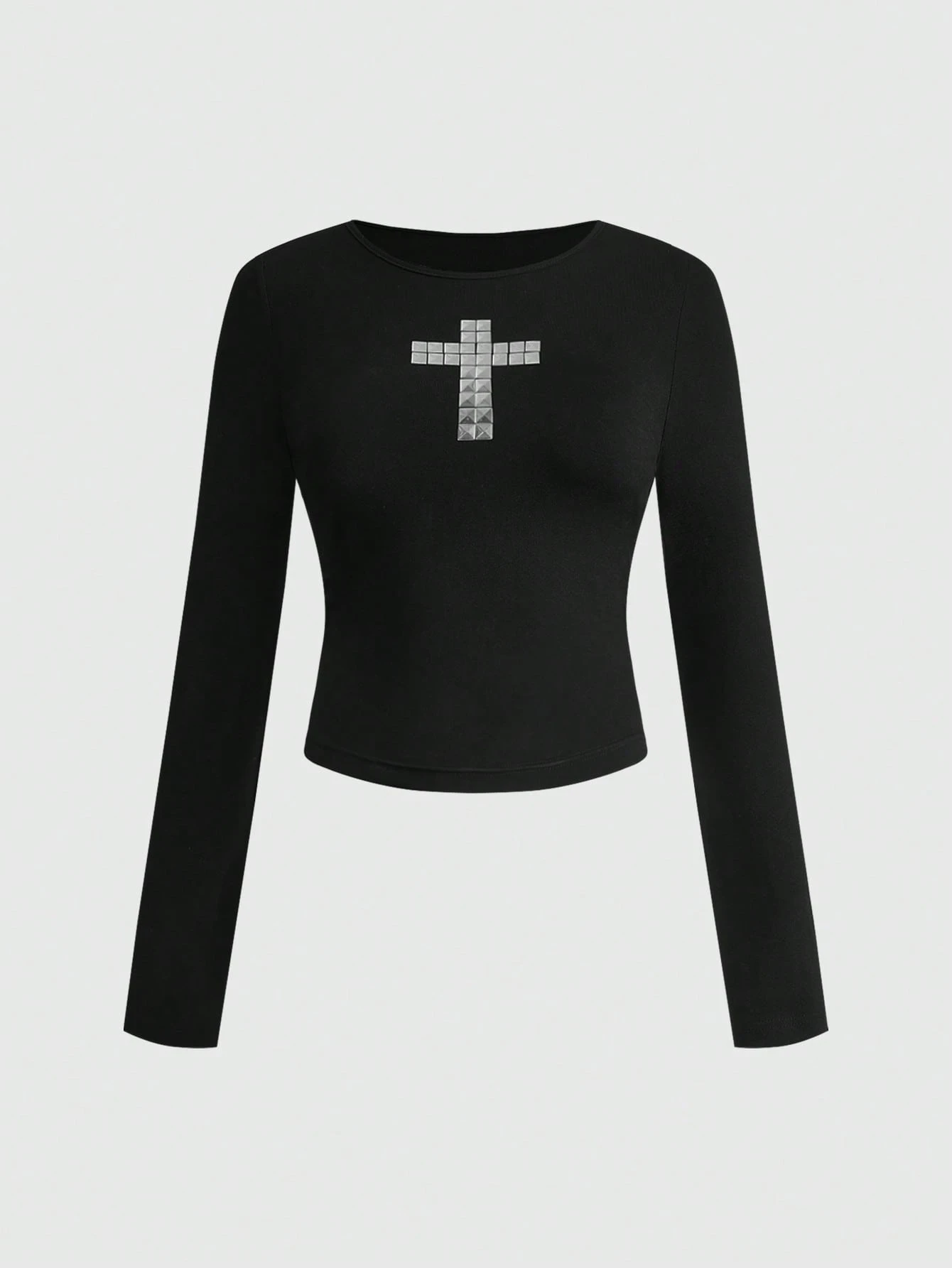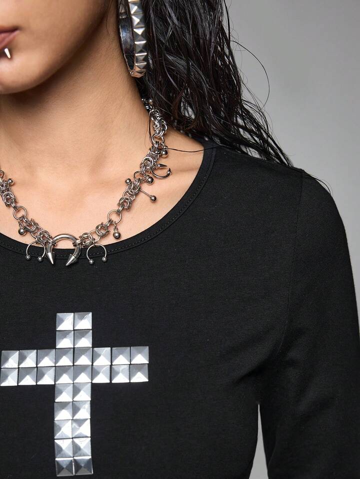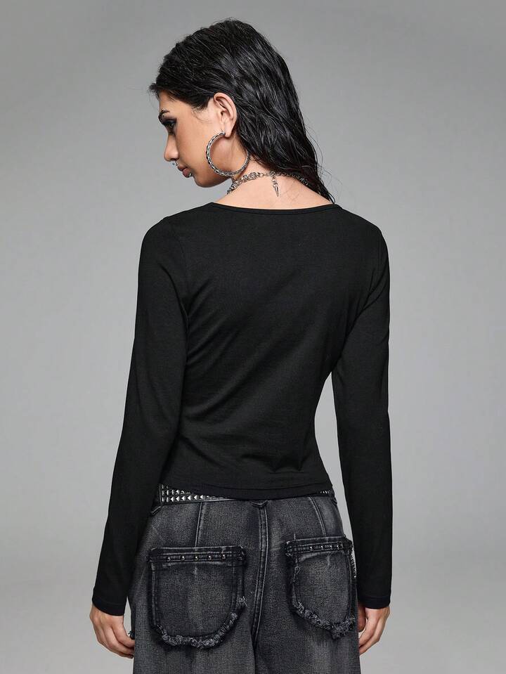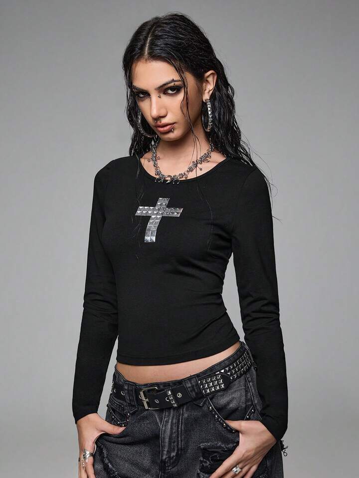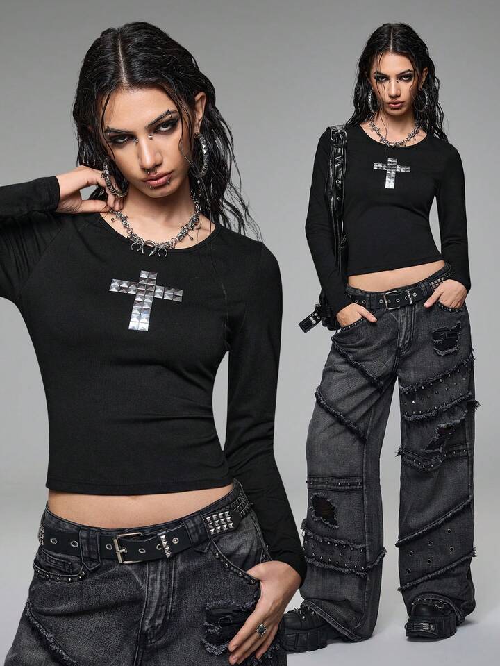 Grunge Punk T-shirt décontracté polyvalent à col rond, manches raglan et motif croisé ajusté pour femmes