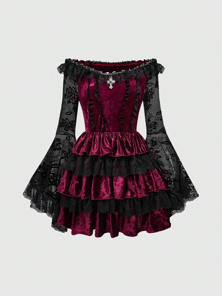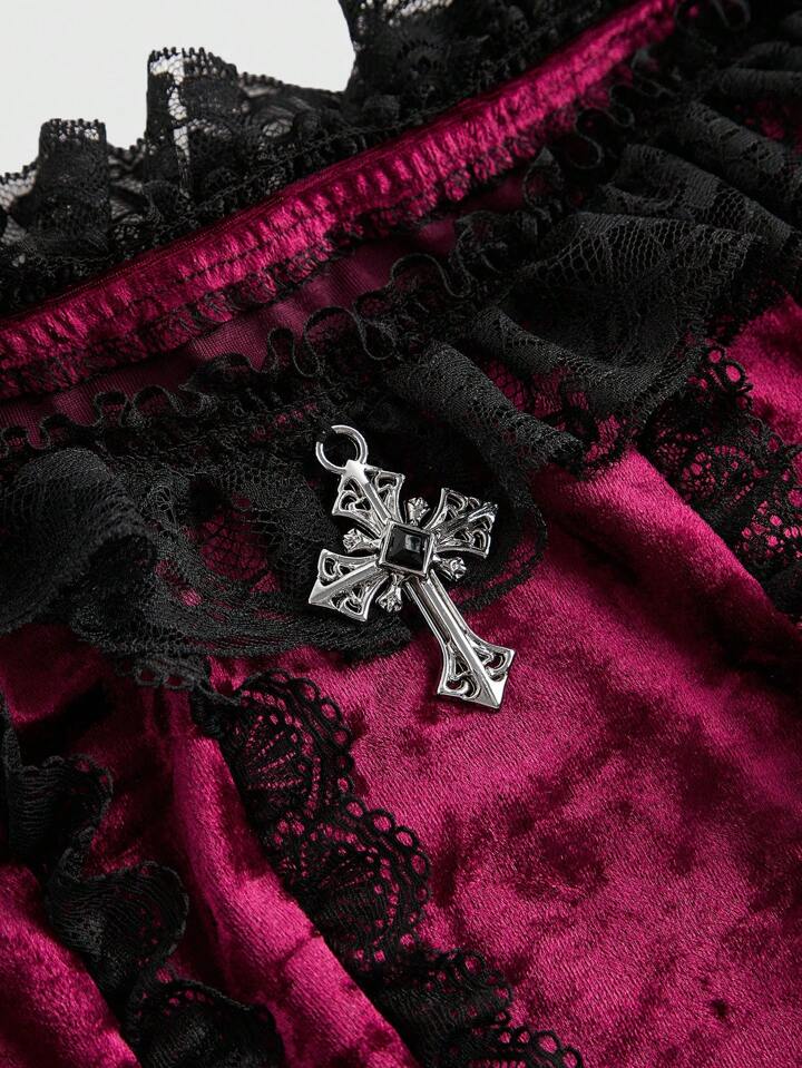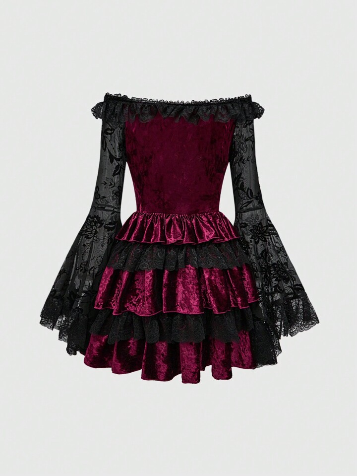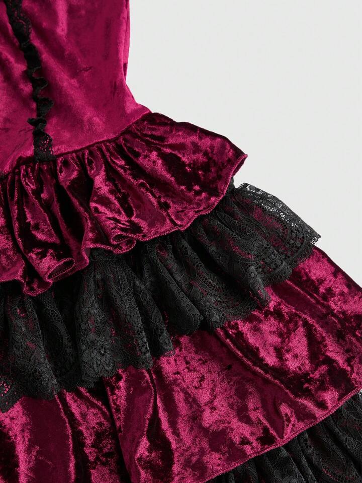 Grunge Punk Robe mini femme vintage Y2K à volants en velours avec bordure en dentelle à l'épaule dénudée, pour le Nouvel An