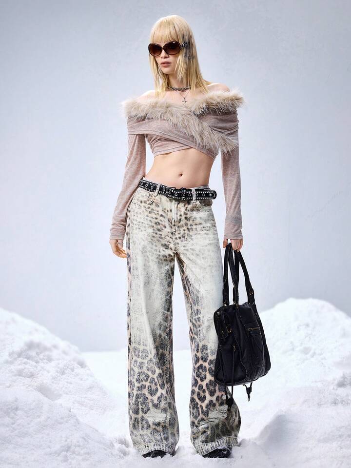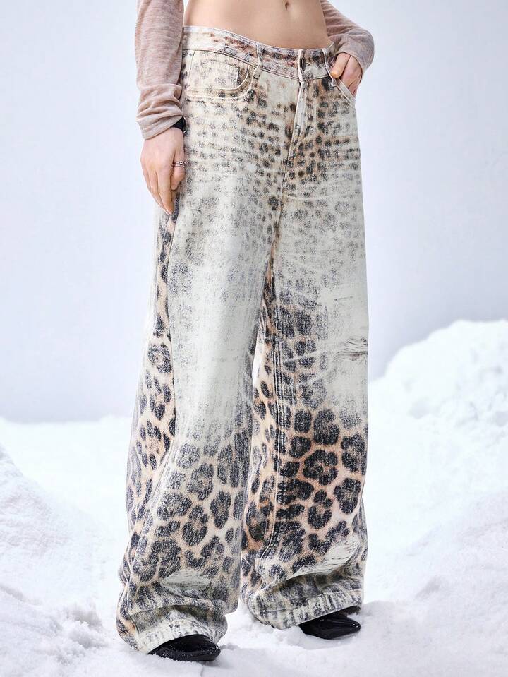 Grunge Punk Jeans larges à taille basse, lâches et à jambes évasées, avec un dégradé léopard, dans le style mode de rue Y2K pour femmes