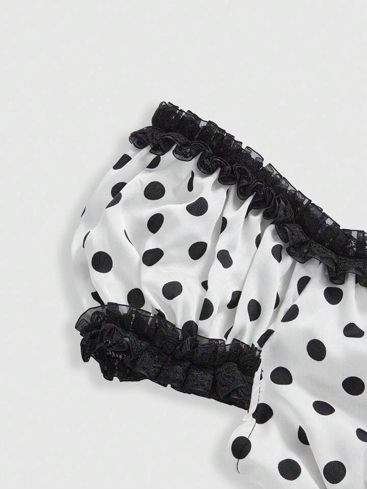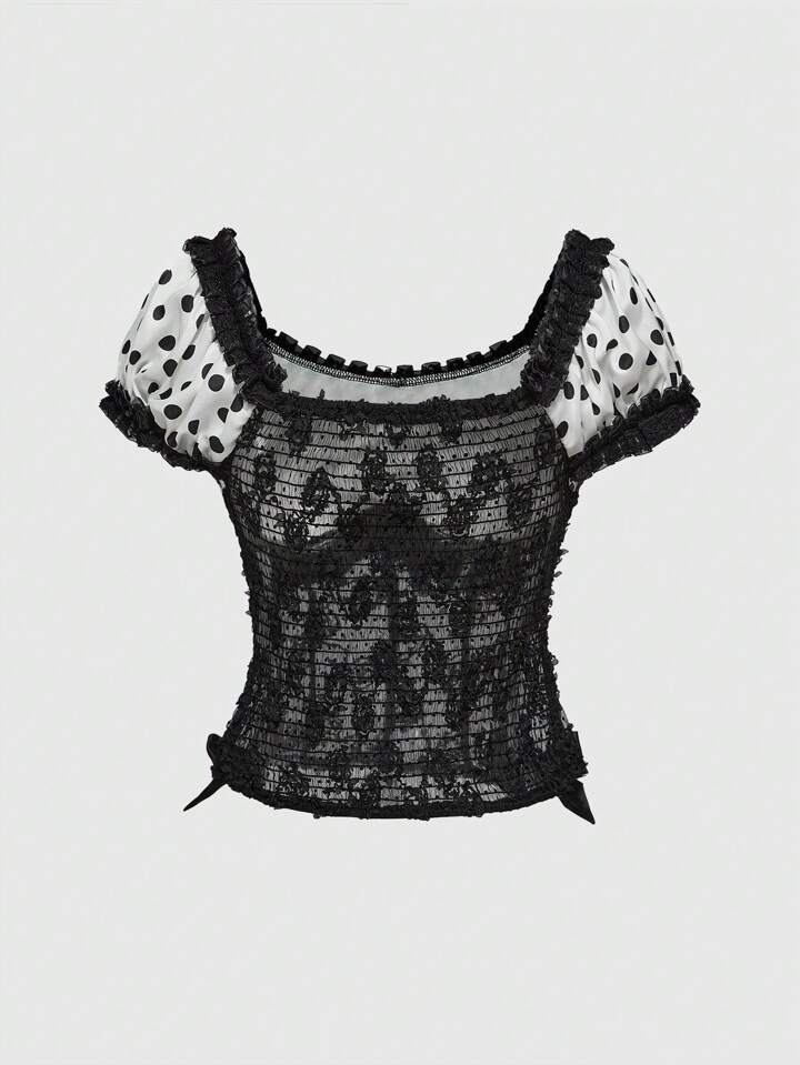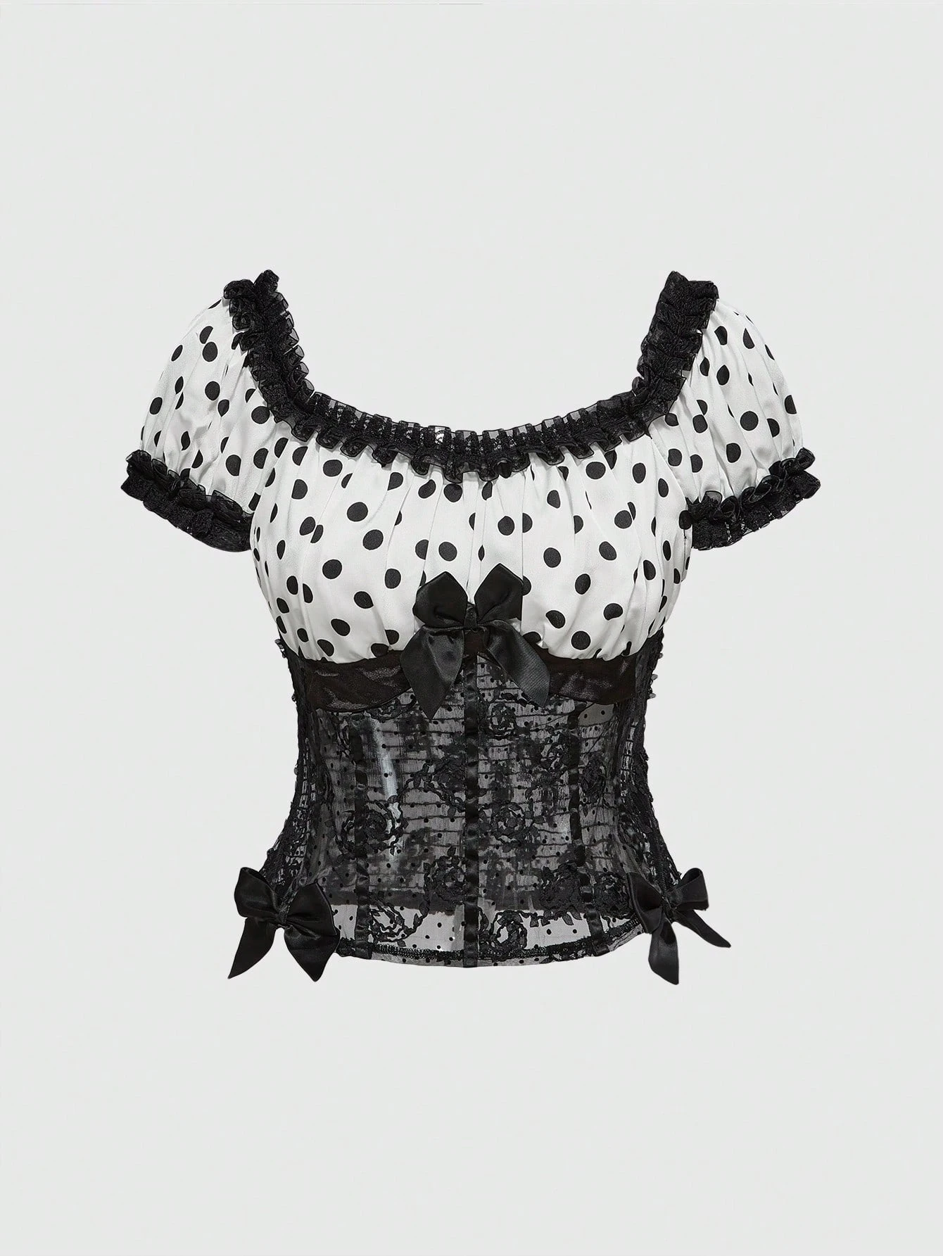 Grunge Punk Top à pois Y2K pour femmes, blouse à dentelle contrastée