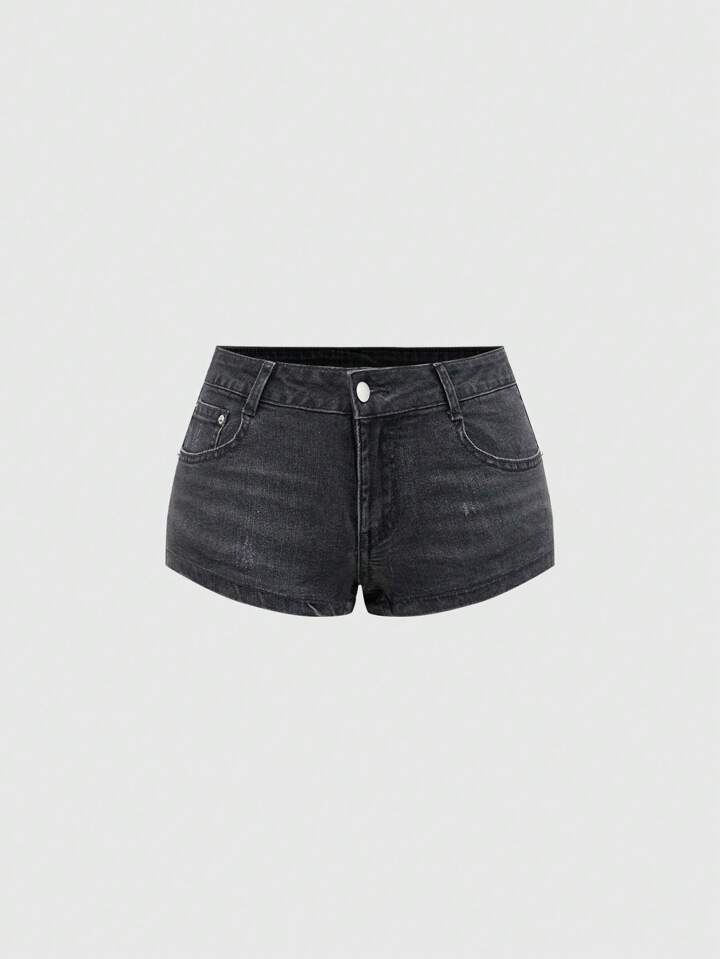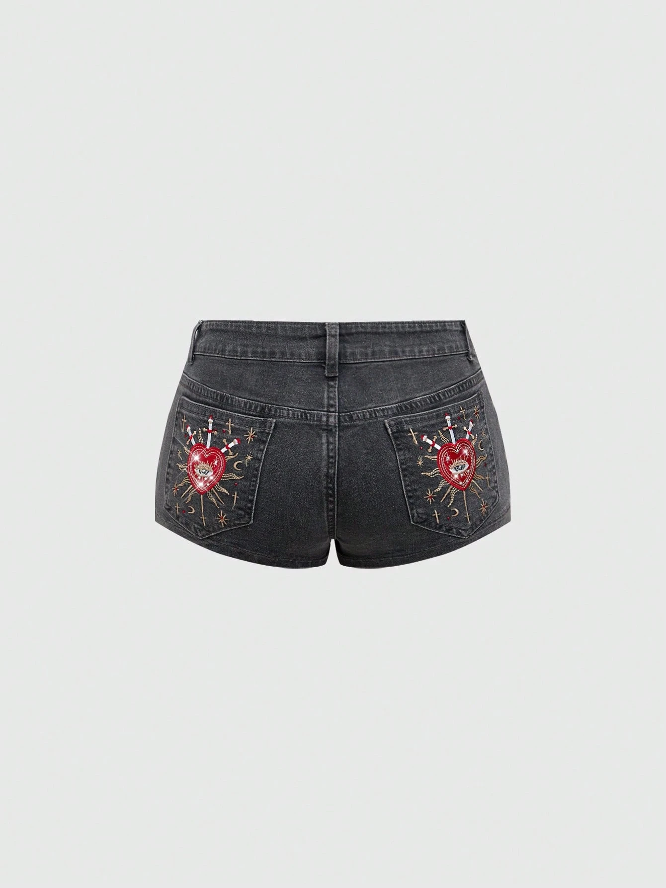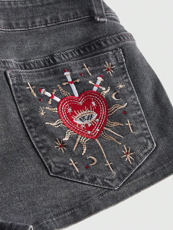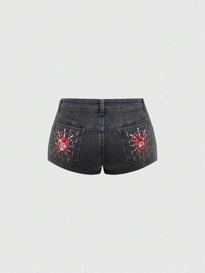 Grunge Punk Short en jean mini effiloché avec broderie de cœur, strass et poches arrière, taille basse rétro Y2K pour femmes