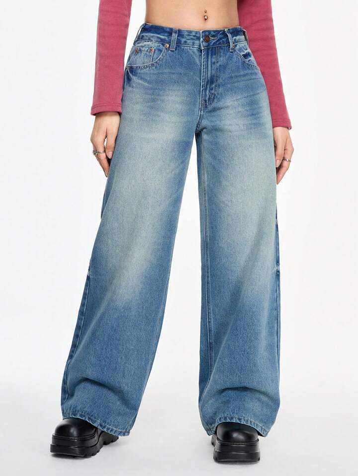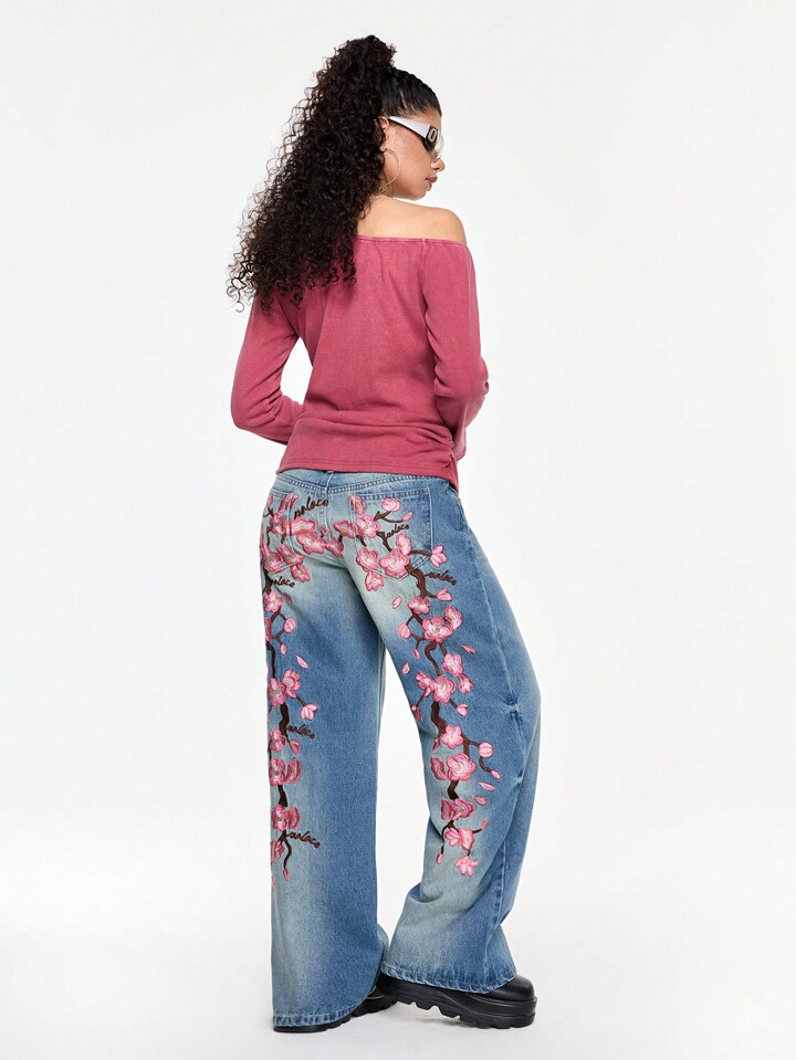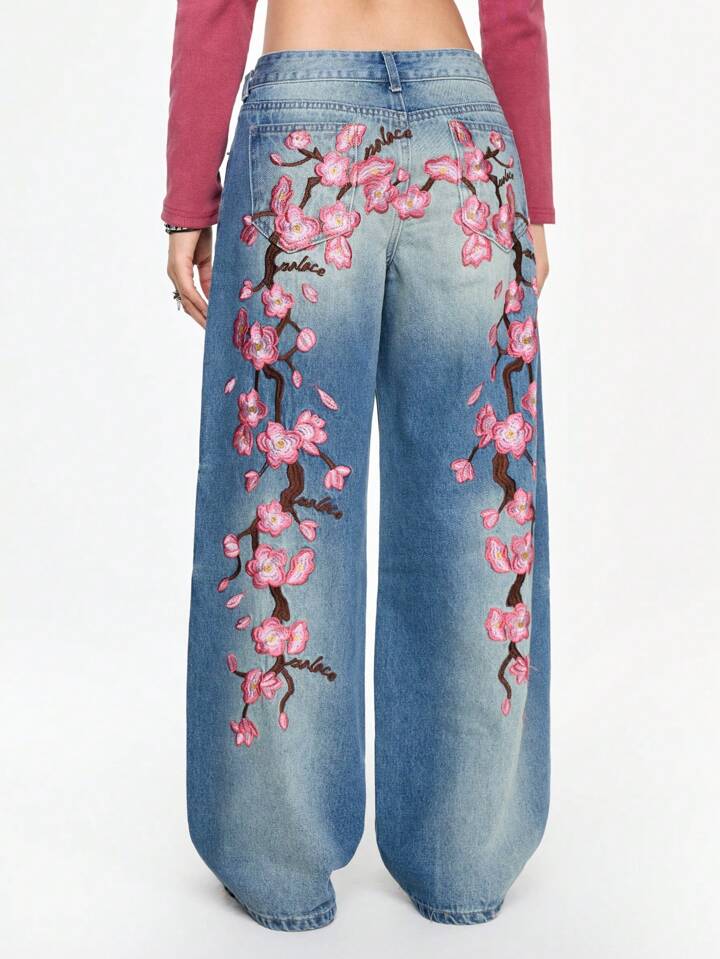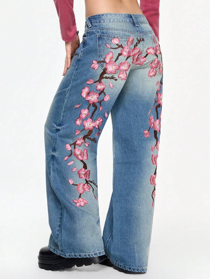 Grunge Punk Jeans amples à taille basse avec broderie de fleurs de cerisier, style streetwear Y2K pour femmes