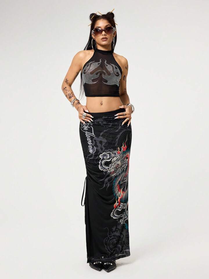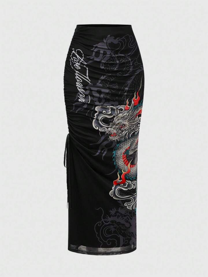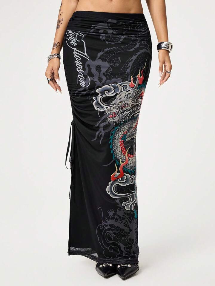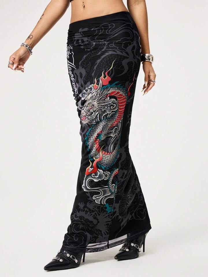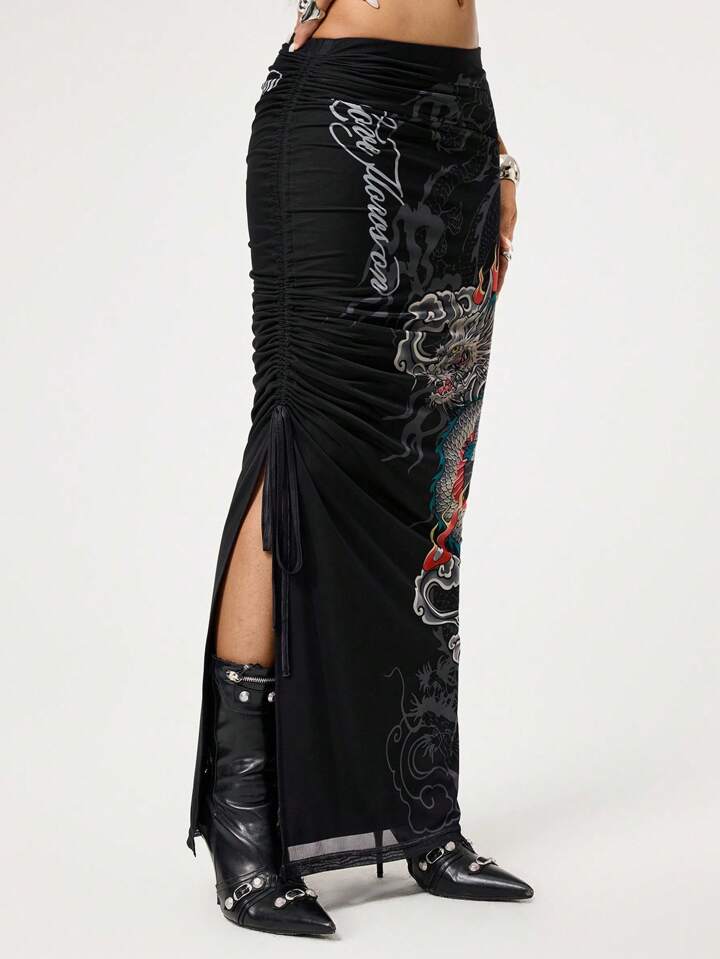 Grunge Punk Jupe moulante maxi à ourlet fendu imprimé tatouage de dragon Y2K