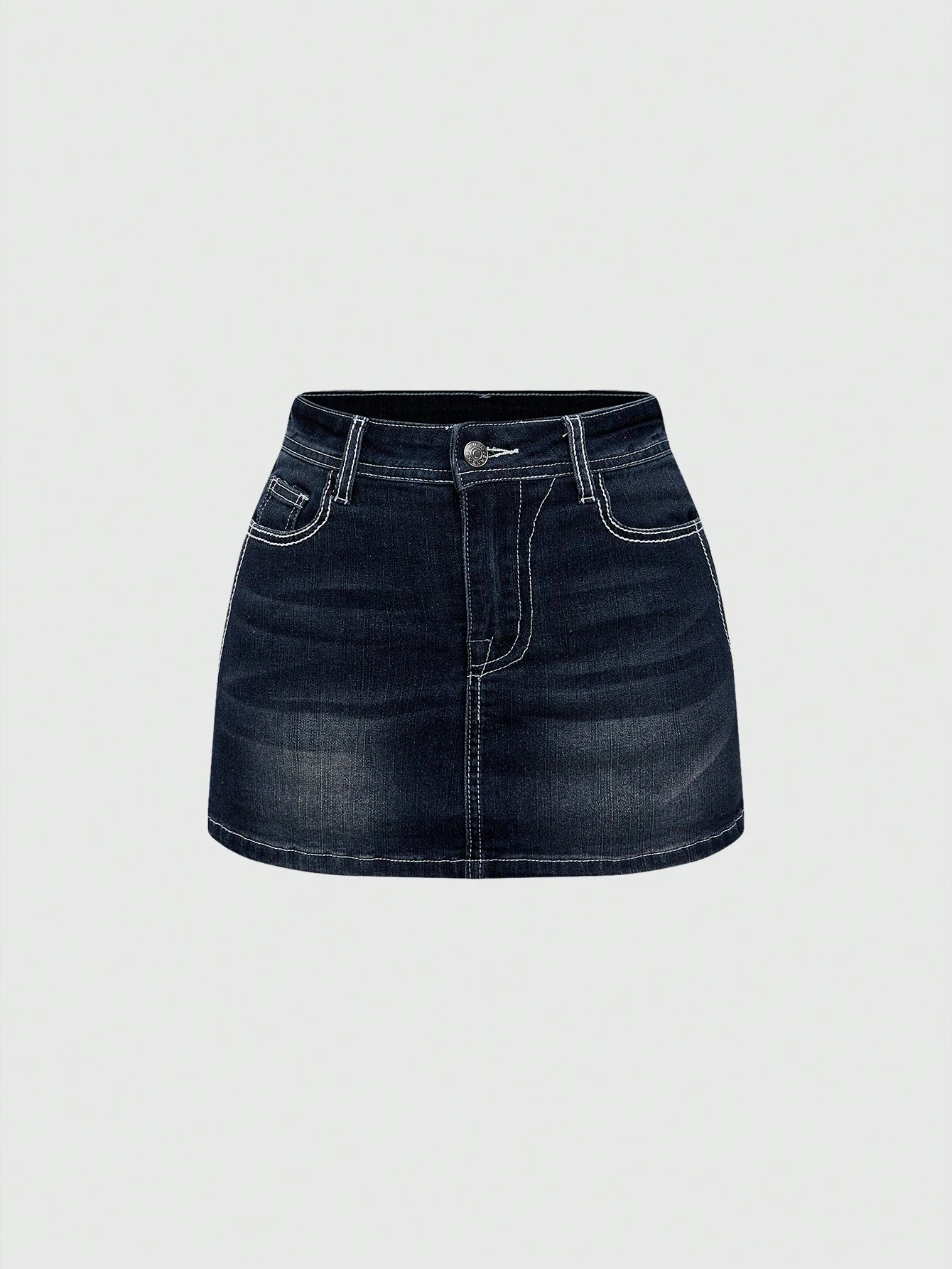 Grunge Punk Mini-jupe en jean taille basse pour femmes avec bandes contrastées, basiques Y2K