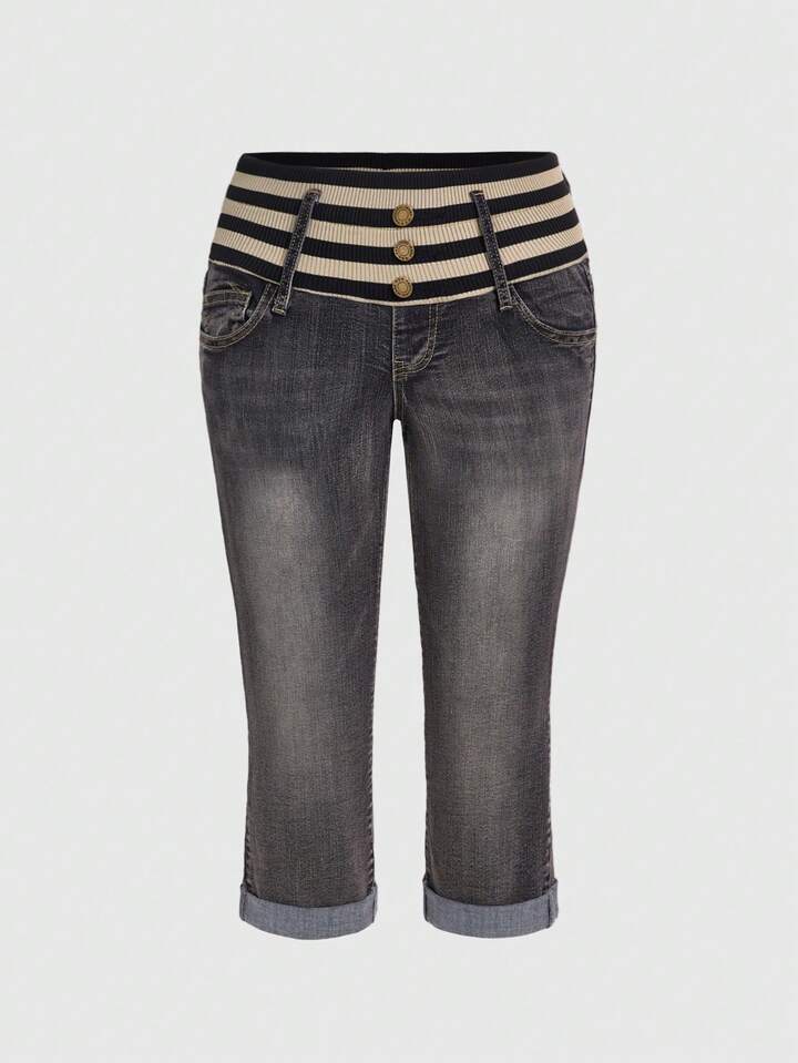 Grunge Punk Jeans capri taille basse pour femmes avec patchwork, taille évasée et court