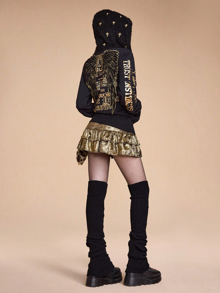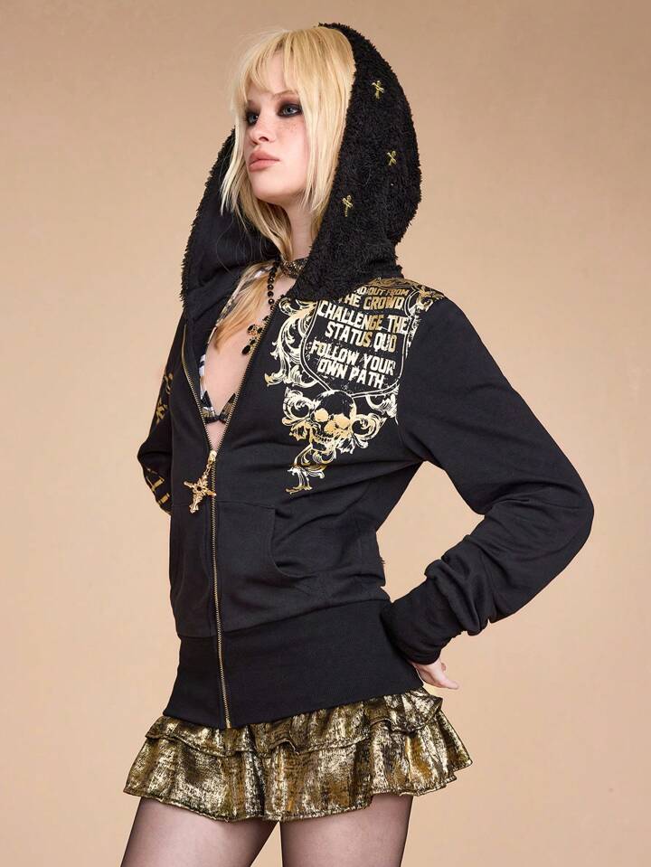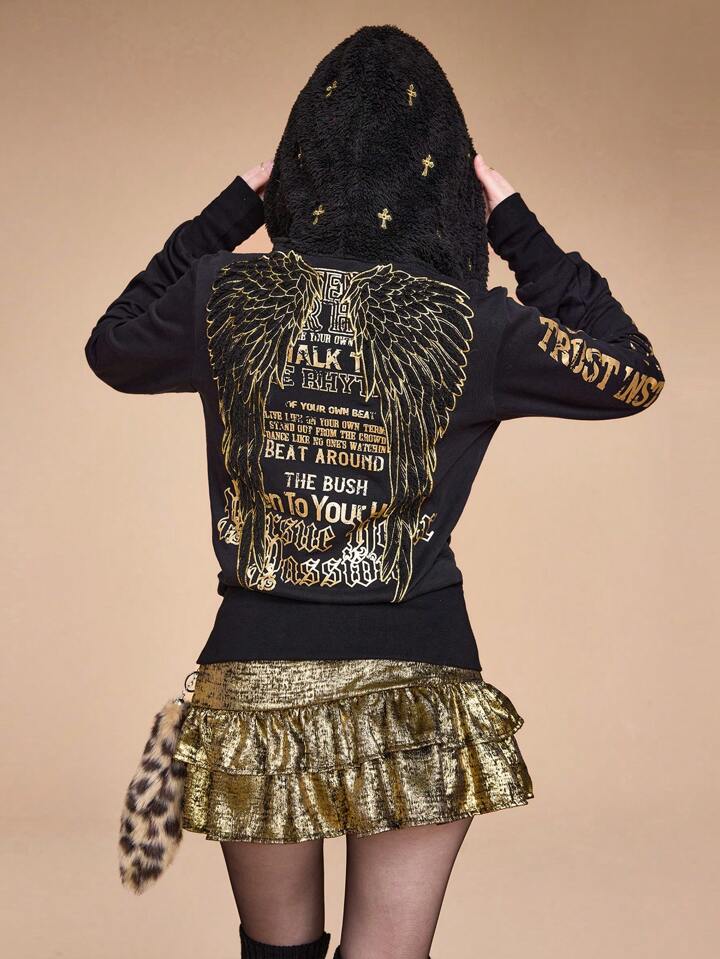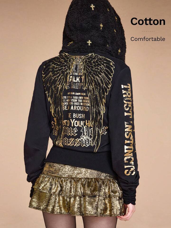 Grunge Punk sweat-shirt à capuche zippé ajusté avec broderie d'ailes d'ange, style Gyaru Harajuku Kpop Y2K pour femmes