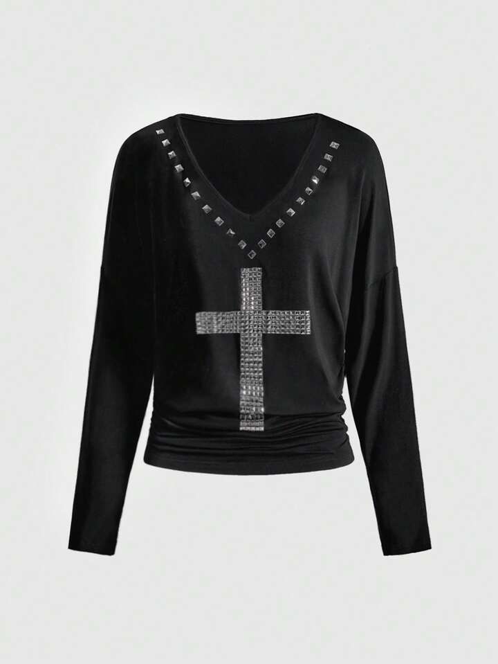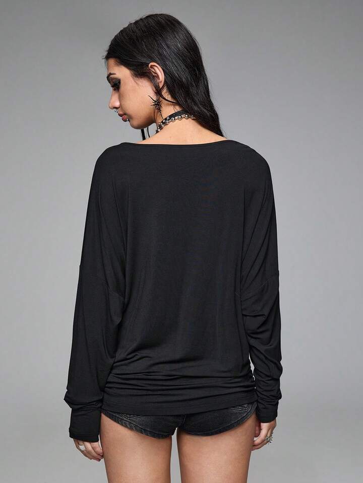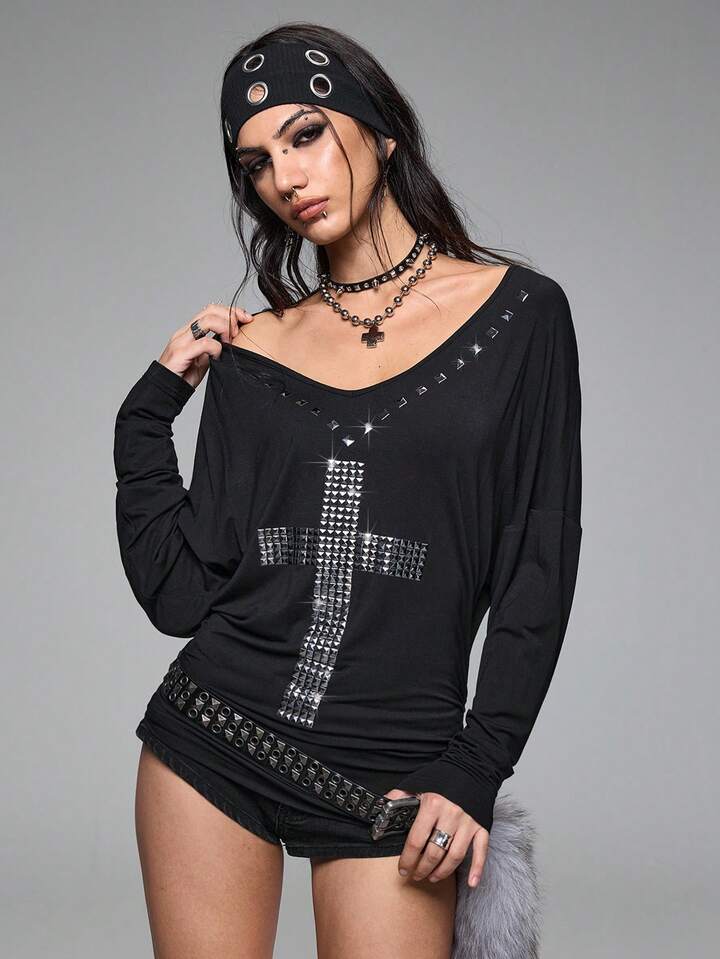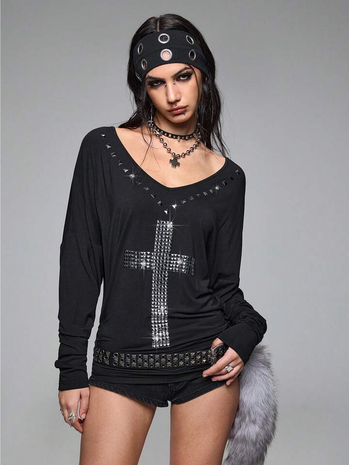 Grunge Punk T-shirt ample à encolure en V avec rivets et manches chauve-souris pour femmes, style Punk Y2K