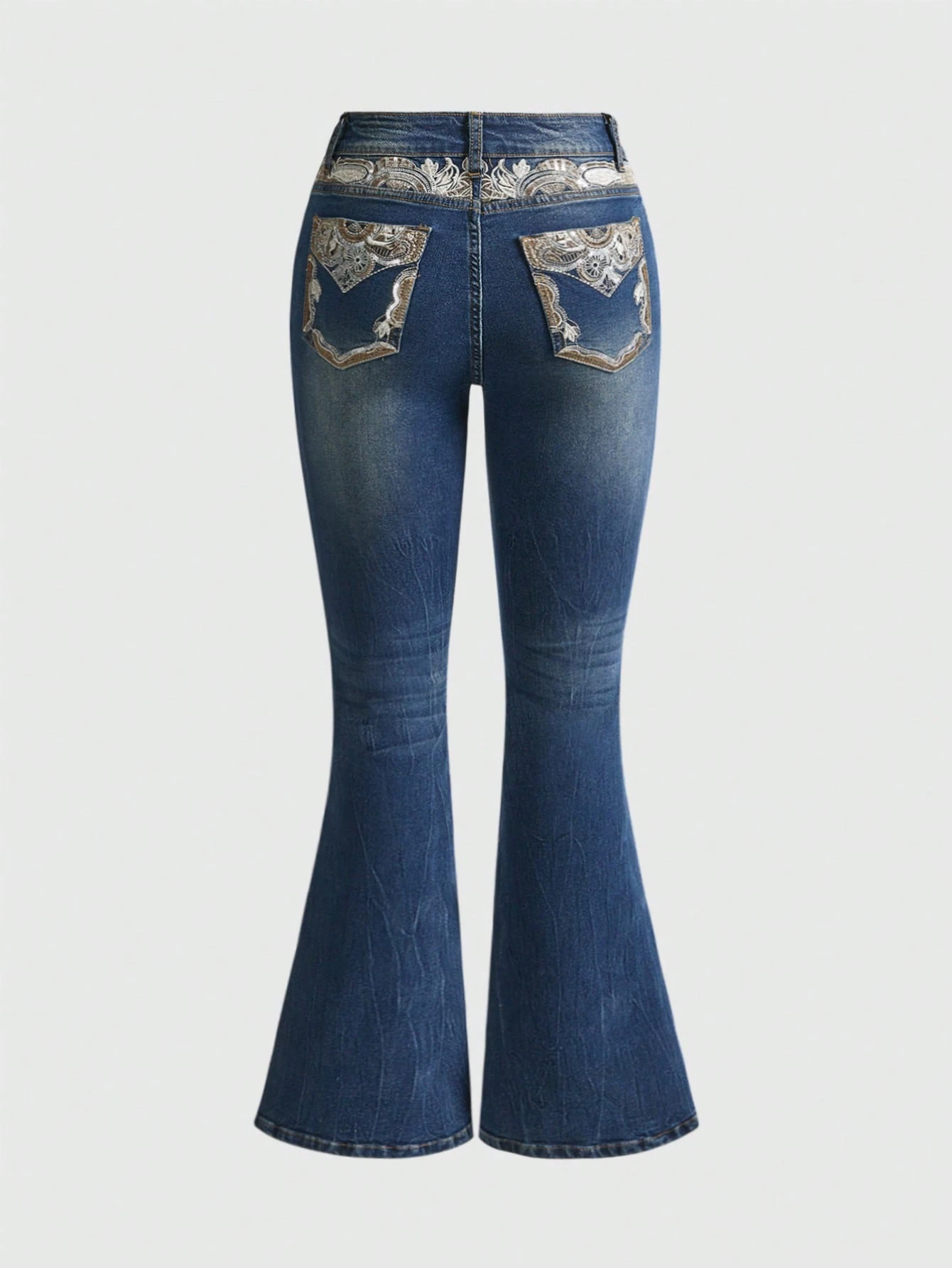 Grunge Punk Jeans slim flare pour femmes avec broderie de fleur de cajou rétro Y2K