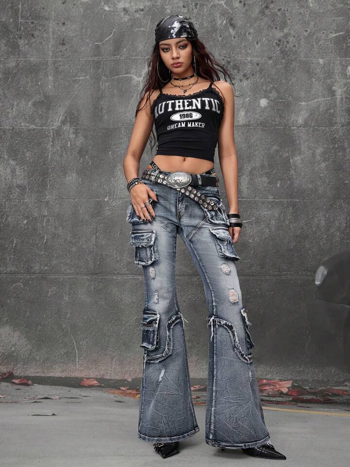 Grunge Punk Jeans évasés taille haute rétro Y2K avec texture déchirée, poches cargo lavées vintage