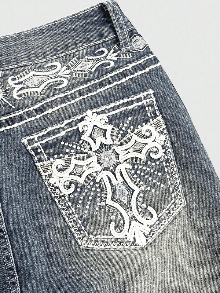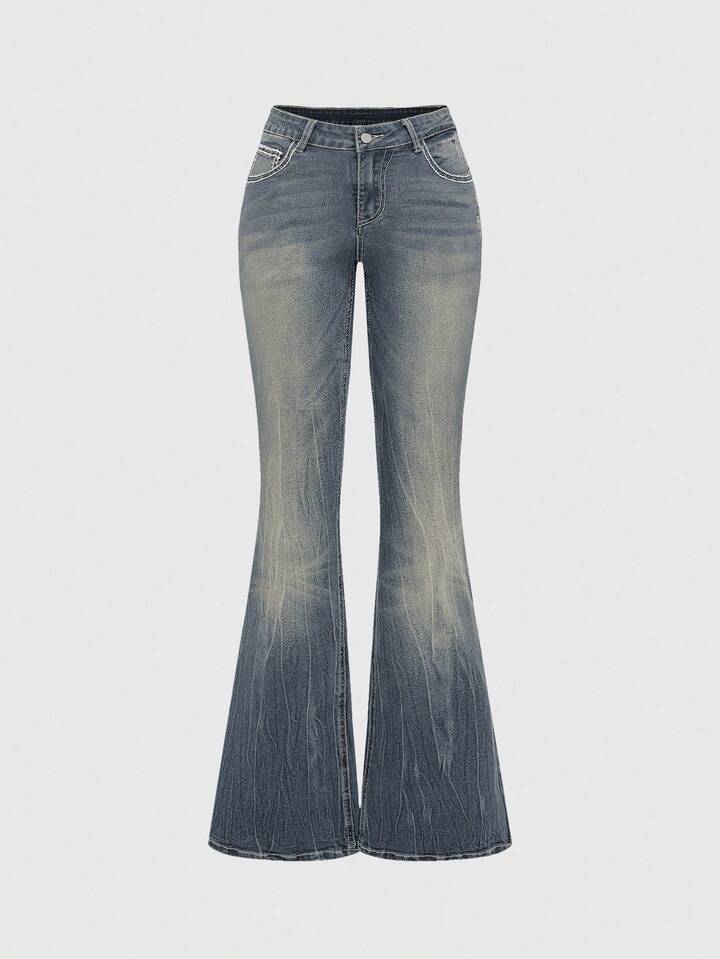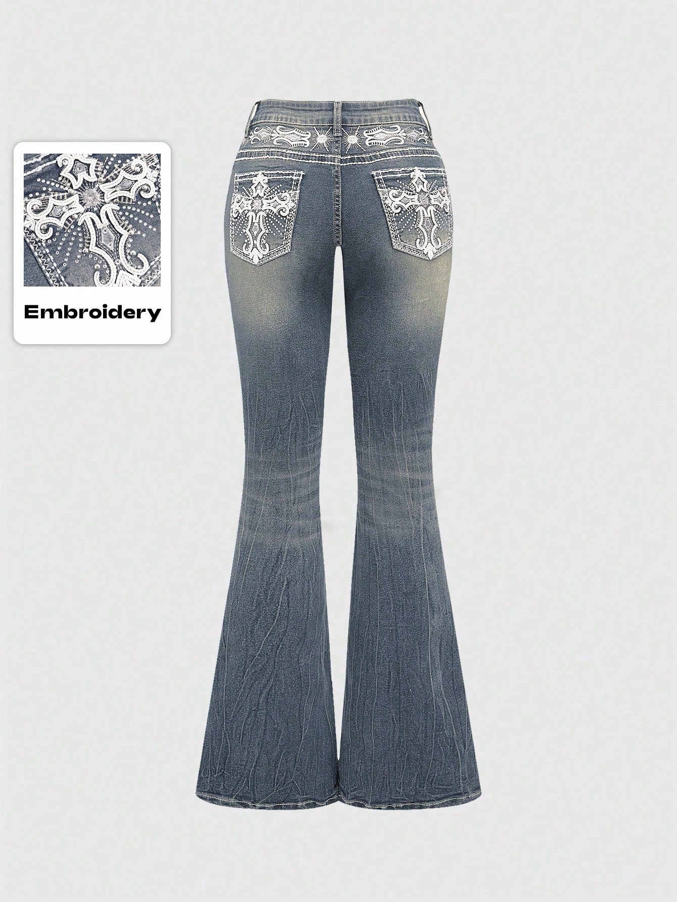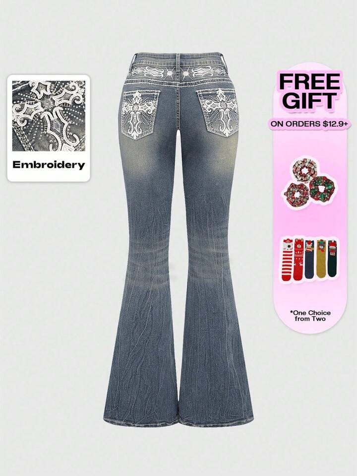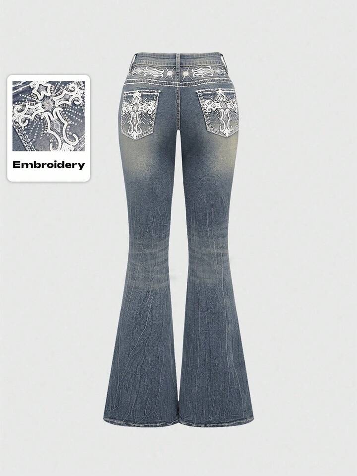 Grunge Punk Jeans femme ajustés à jambe évasée avec poche, broderie en forme d'ailes et dévoilant le ventre, style rétro Y2K