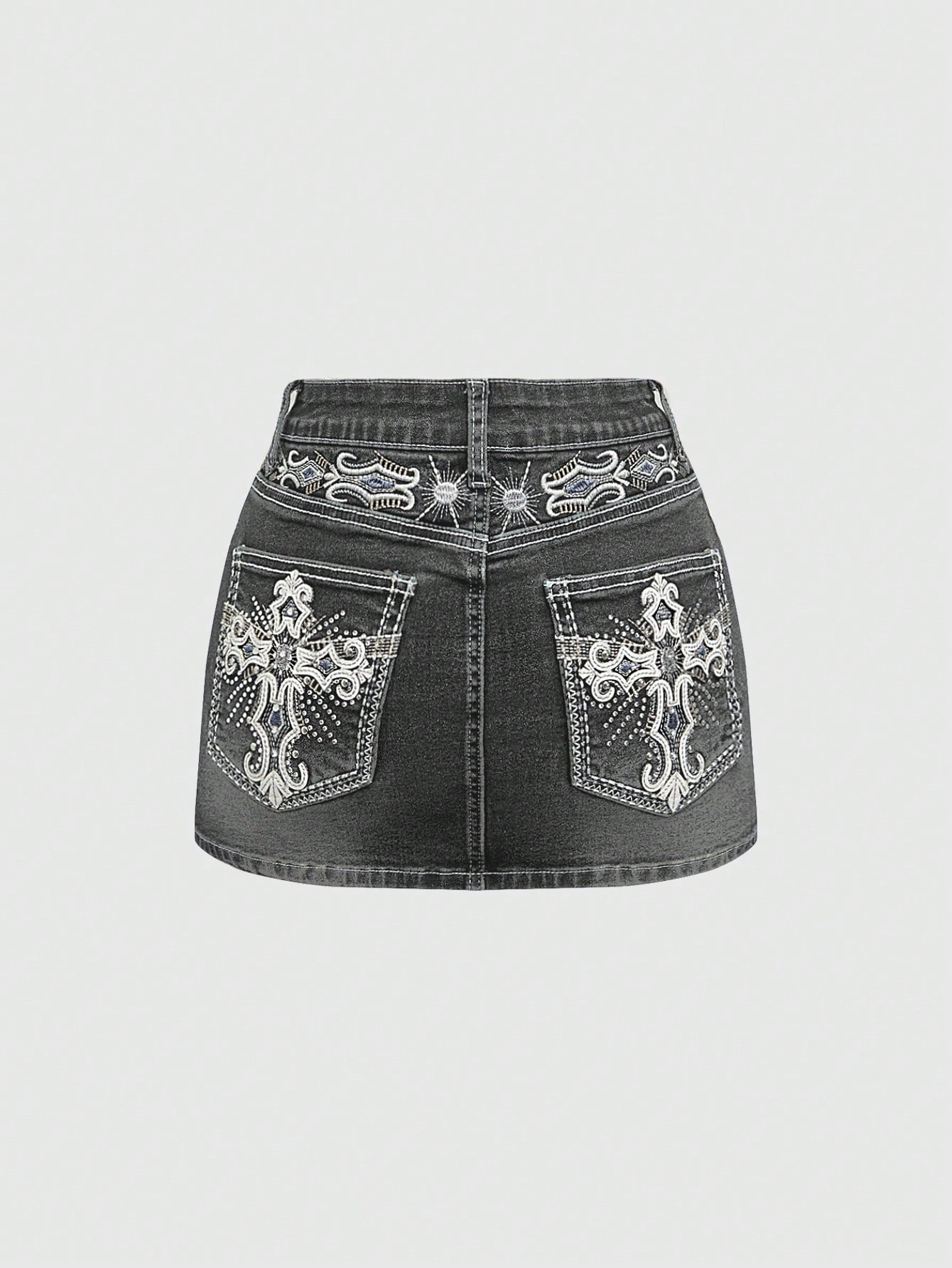 Grunge Punk Mini-jupe rétro Y2K dévoilant le milieu du corps avec broderie croisée et d'aile, comprenant les sous-vêtements (ensemble)