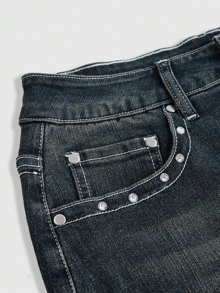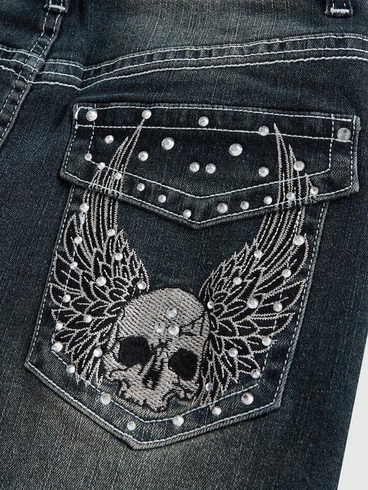 Grunge Punk Jupe en jean mini moulante à poche avec crâne rétro du millénaire et strass aile pour femme, école