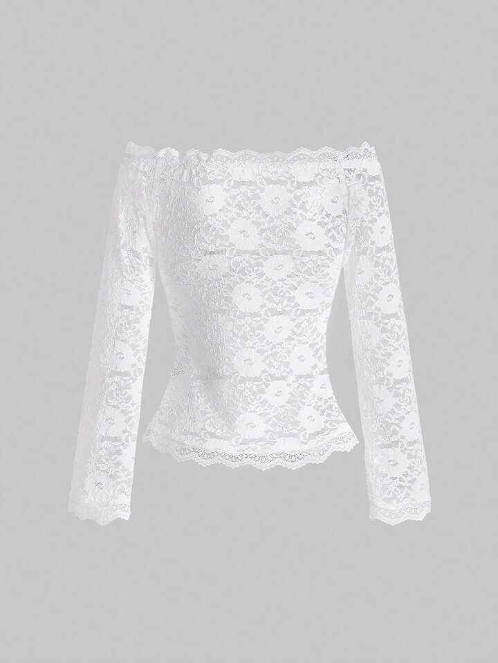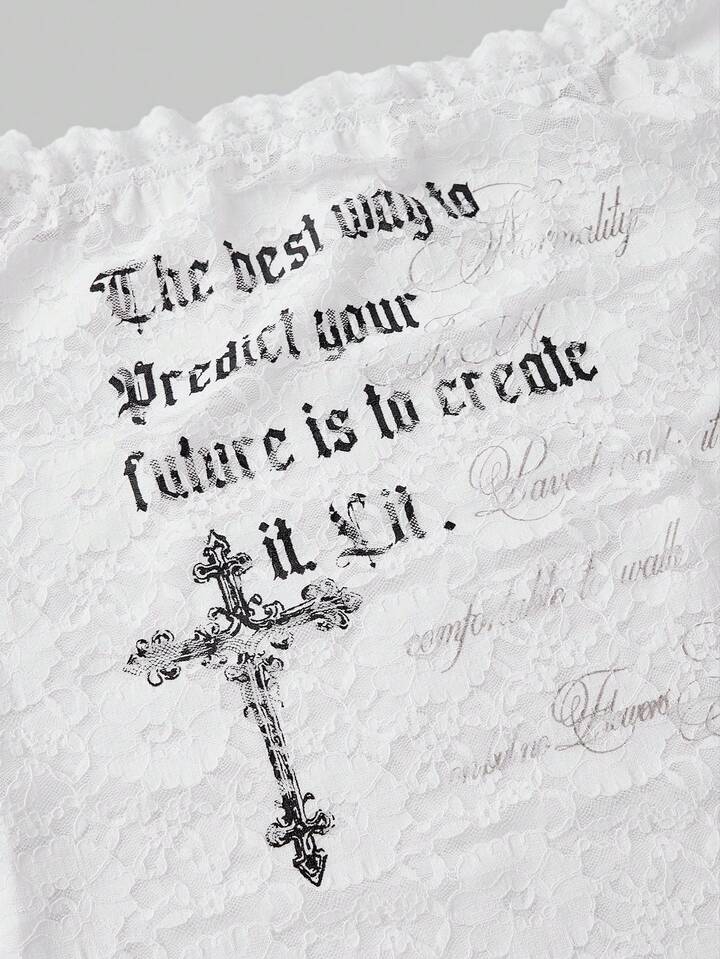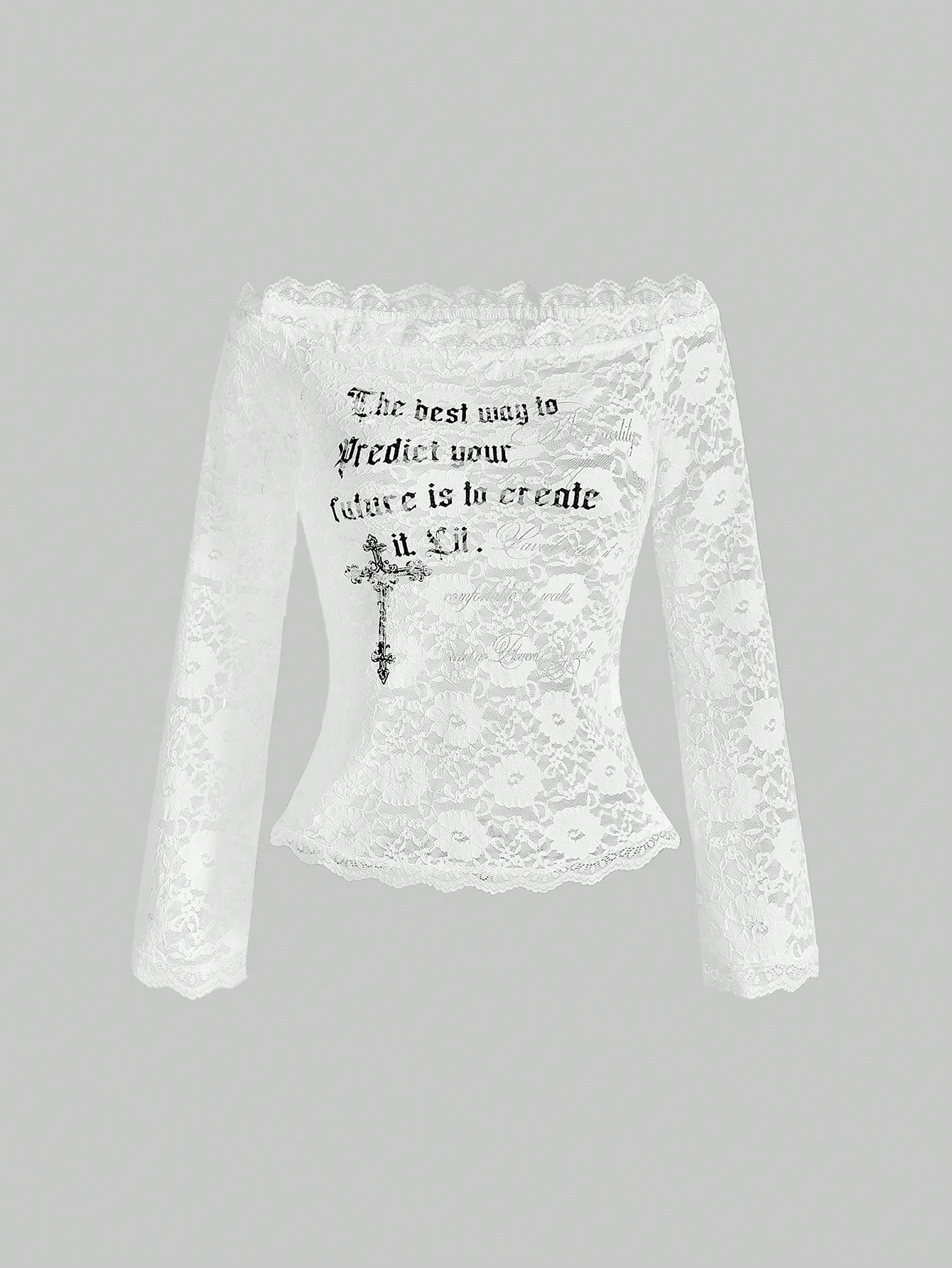 Grunge Punk Blouse en dentelle à épaules asymétriques avec imprimé lettres et croix, sexy style Y2K pour femmes