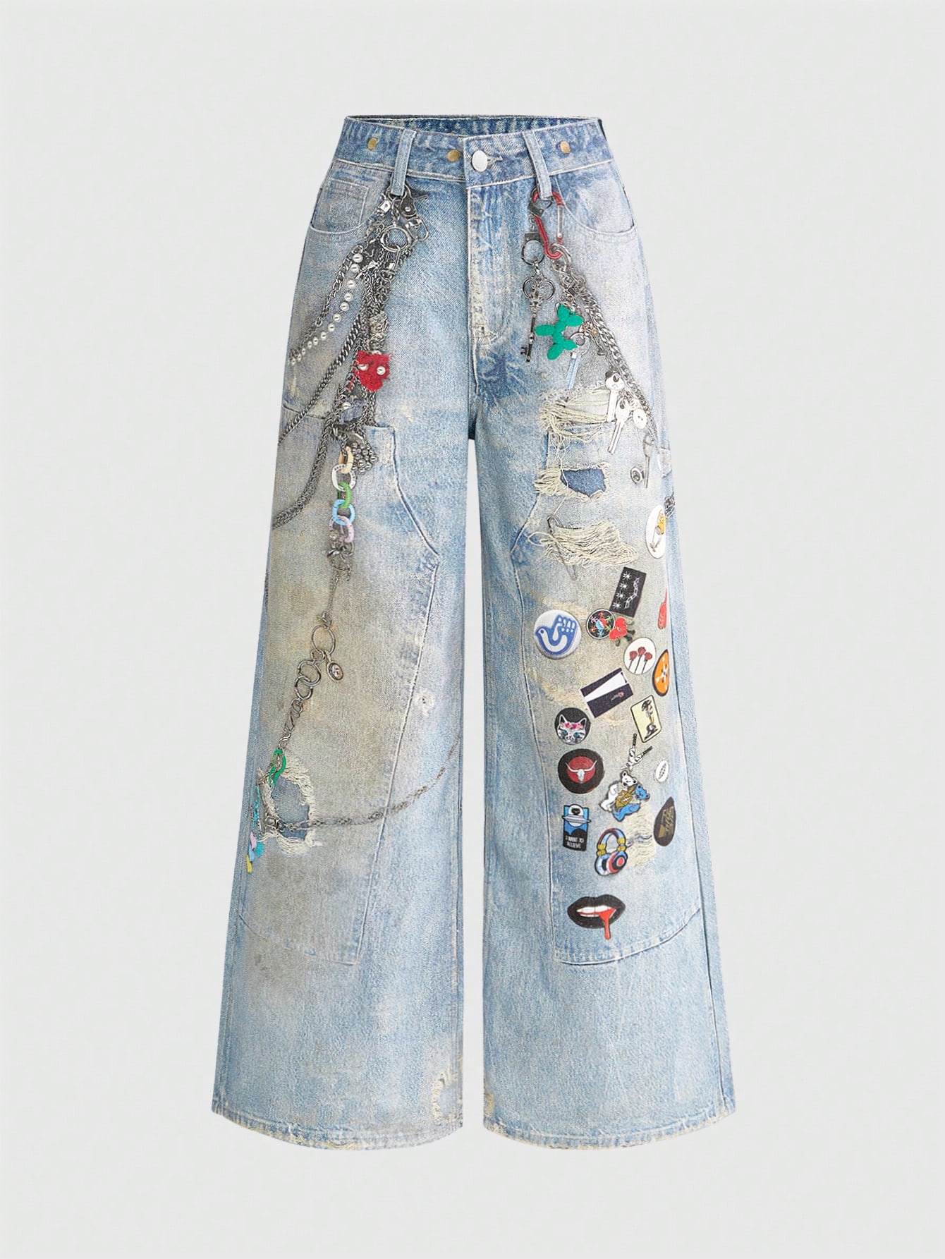 Grunge Punk Jeans à jambes larges pour femmes avec chaîne et impression de badge délavés et sexy style Y2K