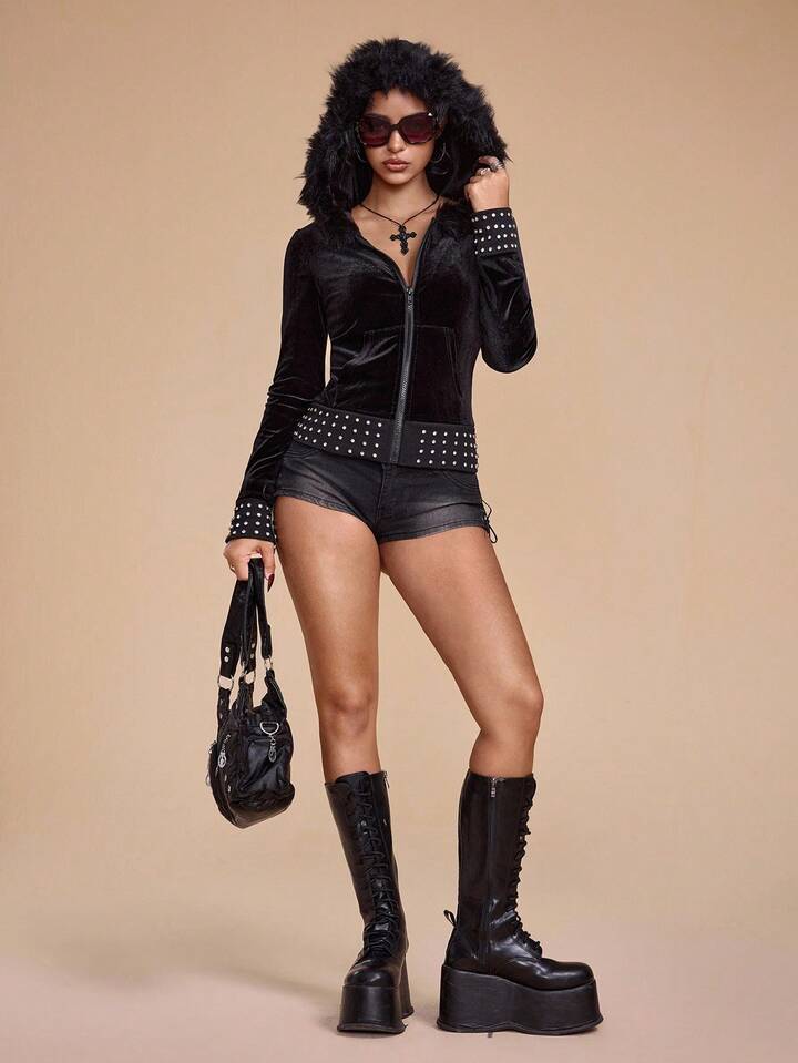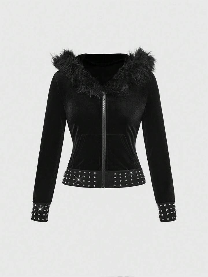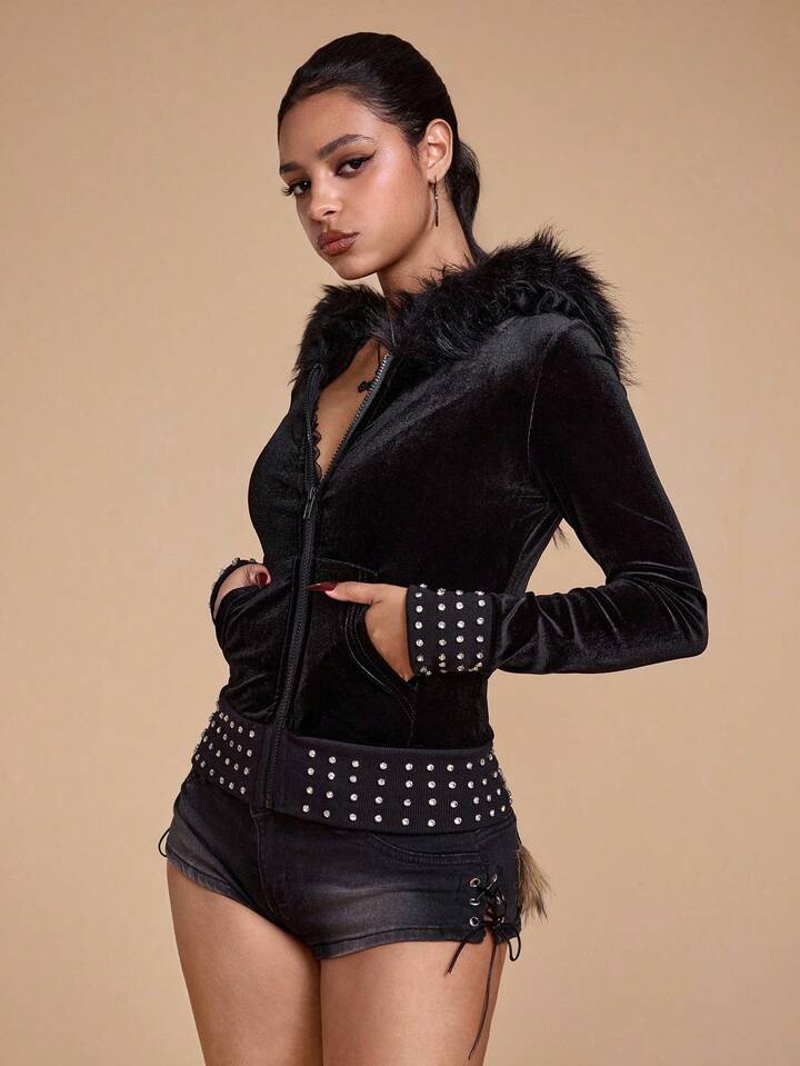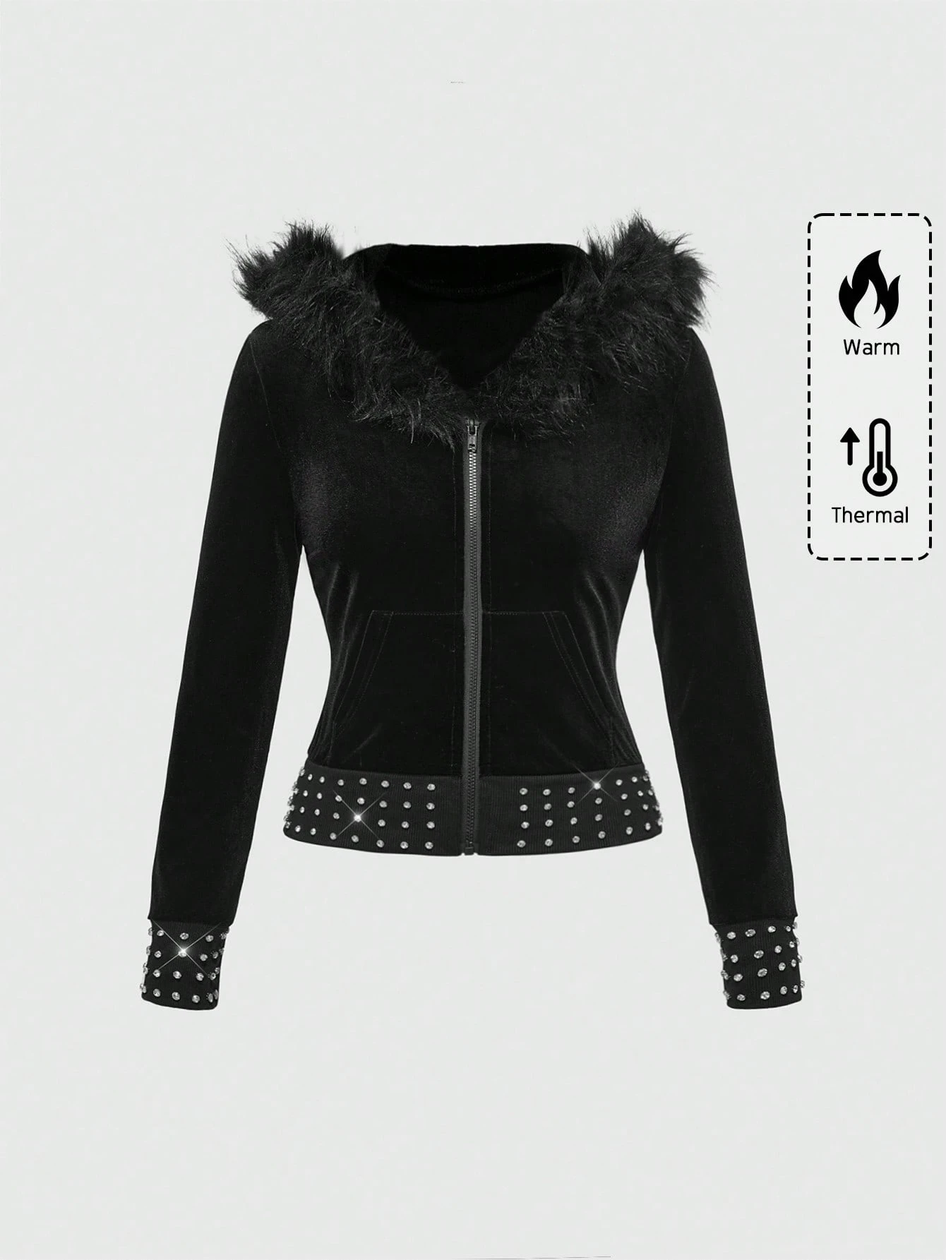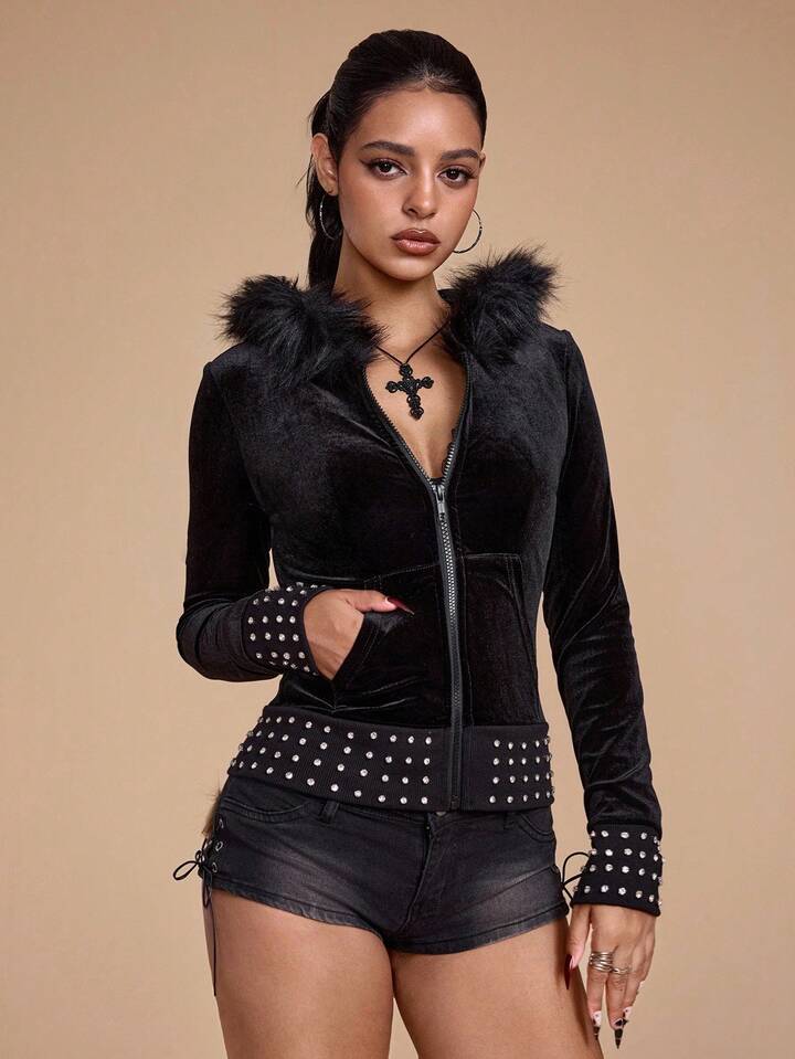 Grunge Punk Sweat-shirt à capuche slim fit en velours sexy Y2K avec ornements de strass pour femmes
