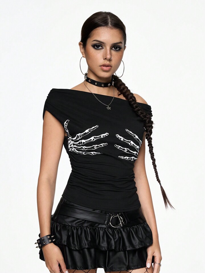 Grunge Punk T-shirt femme imprimé crâne et paume, style Shibuya fille Y2K, coupe étroite à l'épaule plissée, style rétro années 2000. Convient pour des tenues de concert, de rave, de carnaval, de concert country, et des looks d'été pour femmes