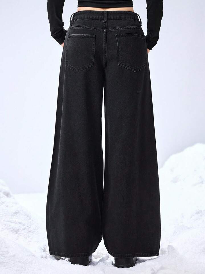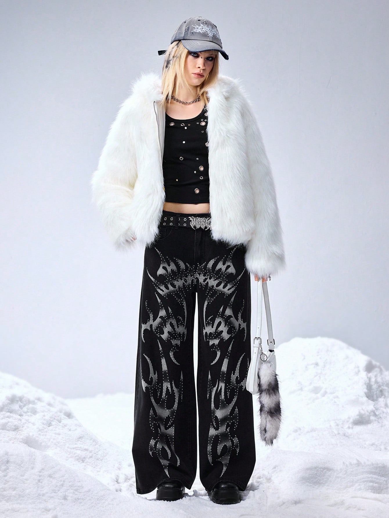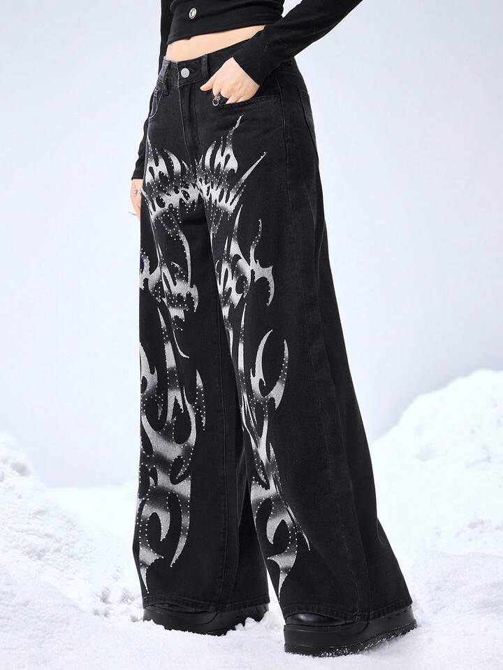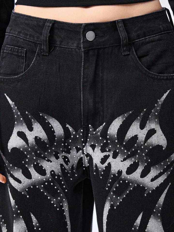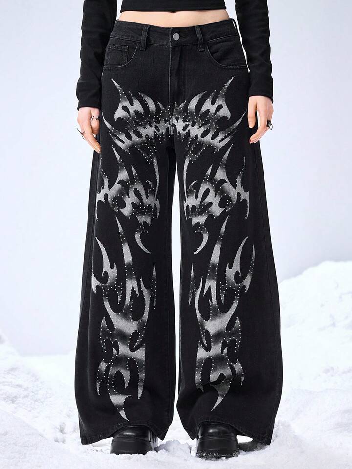 Grunge Punk Jeans ample à jambe large avec motif irrégulier orné de strass, style streetwear chic Y2K pour femmes