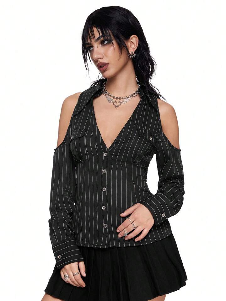Grunge Punk Chemise pour femmes à encolure en V rayée, épaules dénudées, taille resserrée, style Harajuku