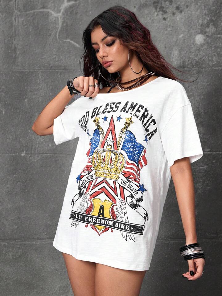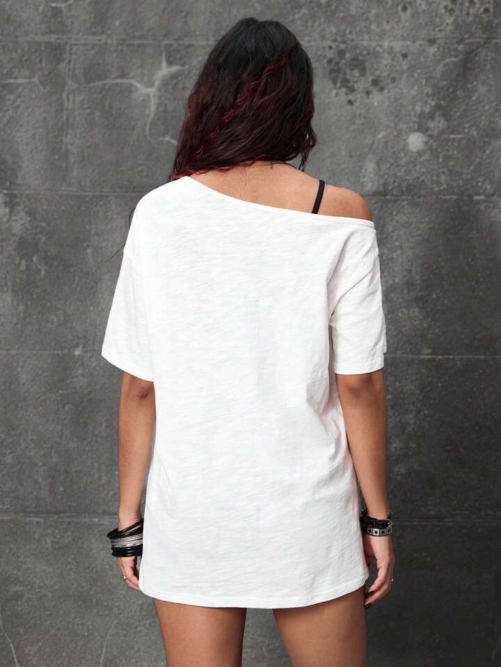 Grunge Punk T-shirt ample décontracté d'été pour femme, style Y2K, avec épaule asymétrique, imprimé couronne et lettre