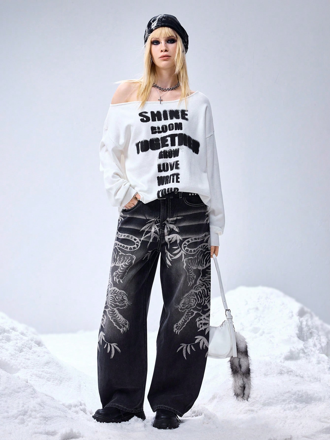 Grunge Punk Jeans amples pour femmes avec ornements de strass de tigre chinois de la sous-culture Y2K