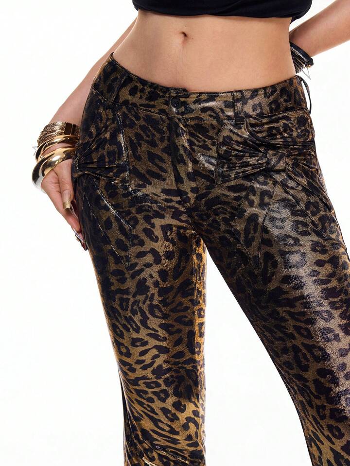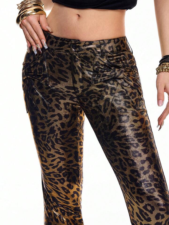 Grunge Punk Pantalon skinny taille basse avec patch nœud en feuille d'or à imprimé léopard, style sous-culture Y2K Harajuku