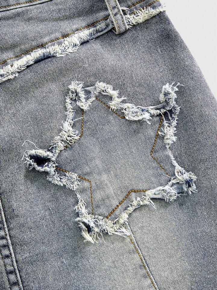 Grunge Punk Mini-jupe en jean moulante délavée avec ourlet effiloché, étoile brodée, style varsity Y2K
