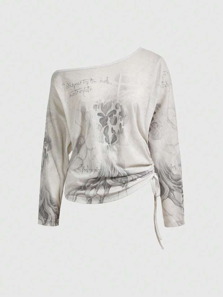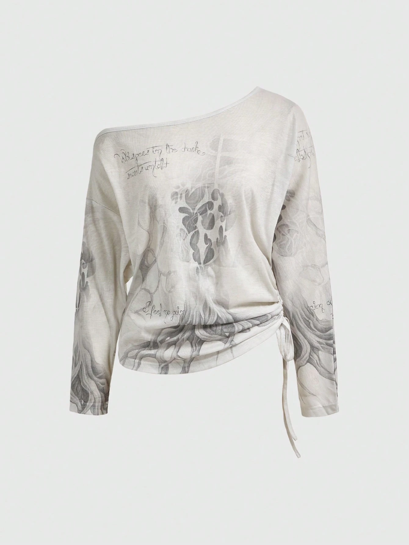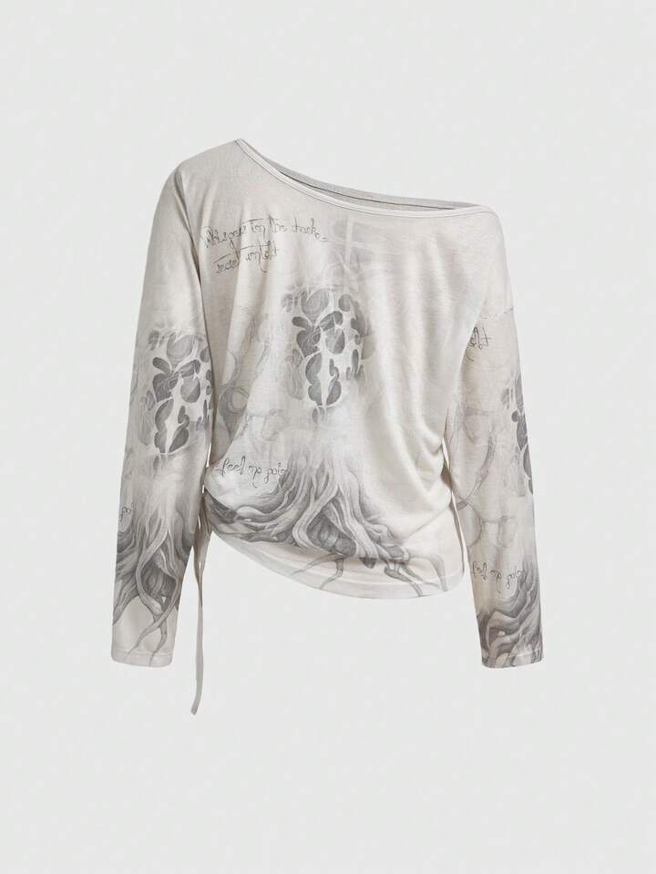 Grunge Punk Top à manches longues avec imprimé abstrait oblique, cordon de serrage sur le côté de l'épaule