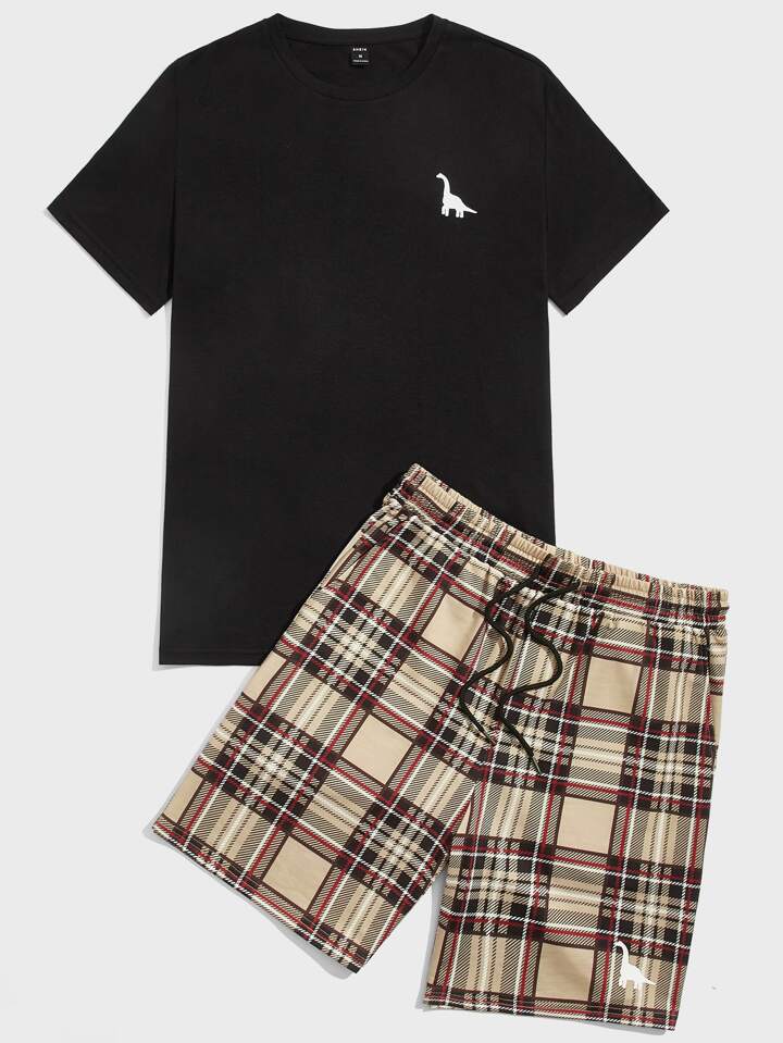 Homme T-shirt à imprimé dinosaure & Short à carreaux à cordon