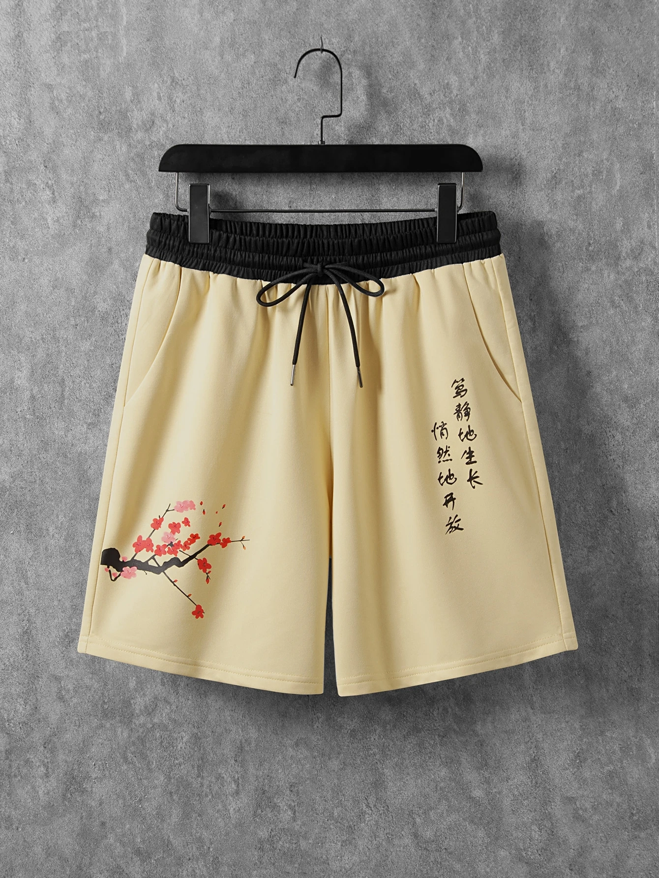 Homme Short à imprimé lettre japonaise et floral à cordon