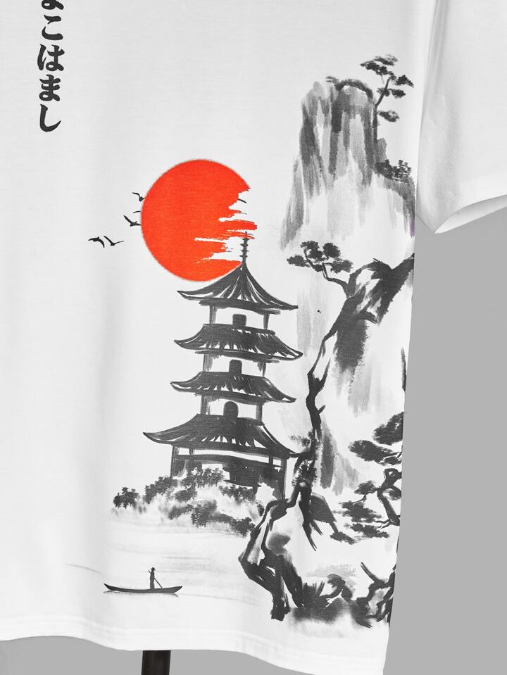 T-shirts pour hommes ajustés, col ras du cou, manches courtes, tee-shirt graphique paysage, mode décontractée japonaise en polyester, été