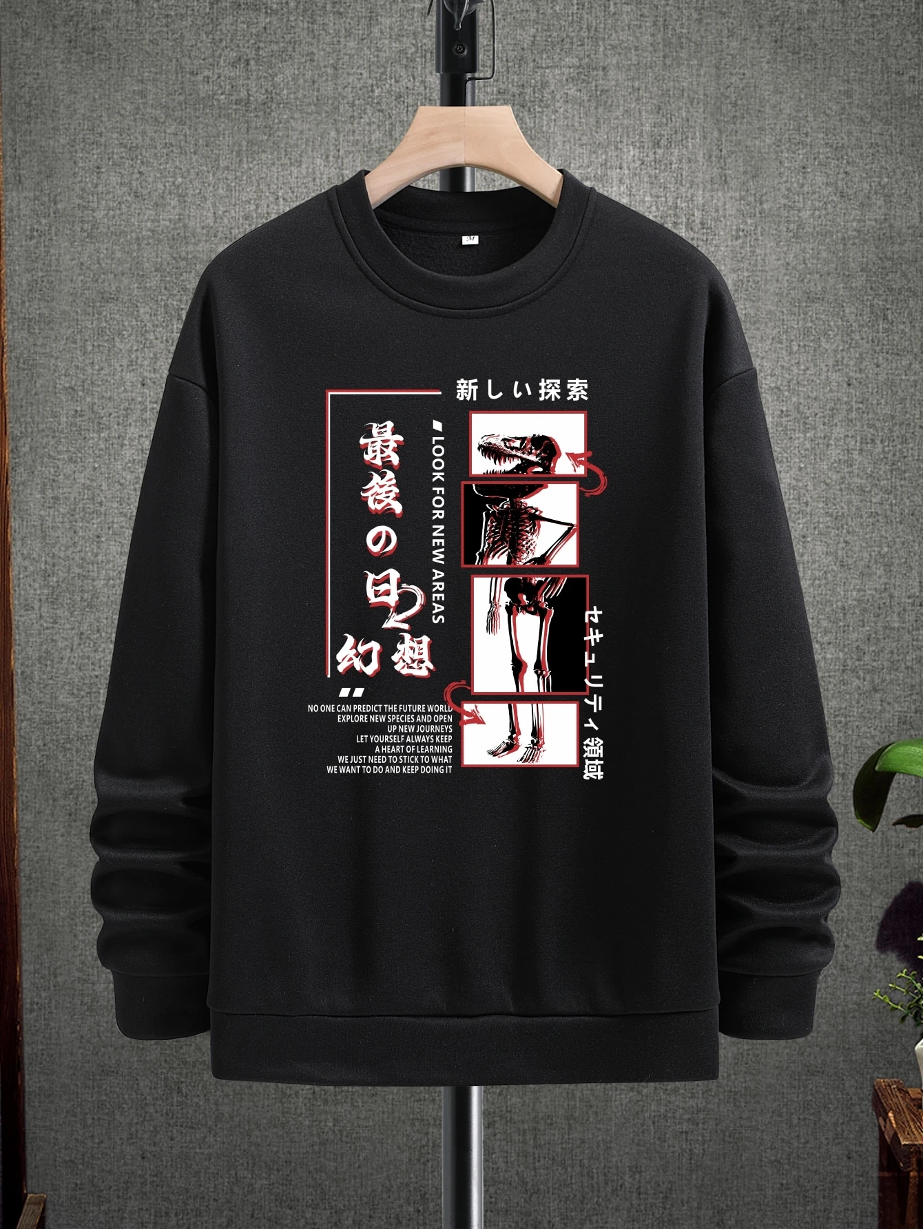 Homme Sweat-shirt thermique avec motif caractère japonais et squelette