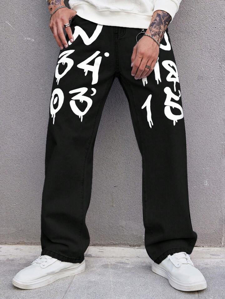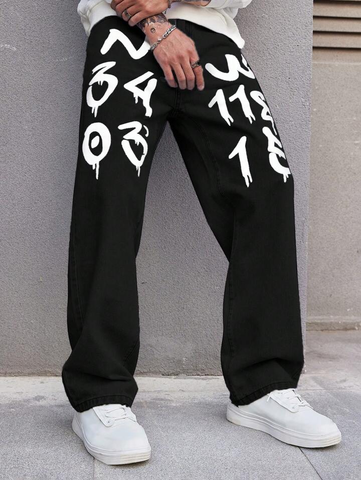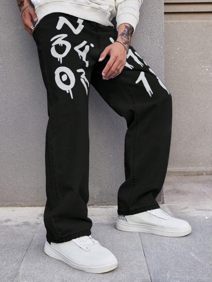 Jeans en coton pour hommes à coupe ample avec graphiques de lettres et jambe droite