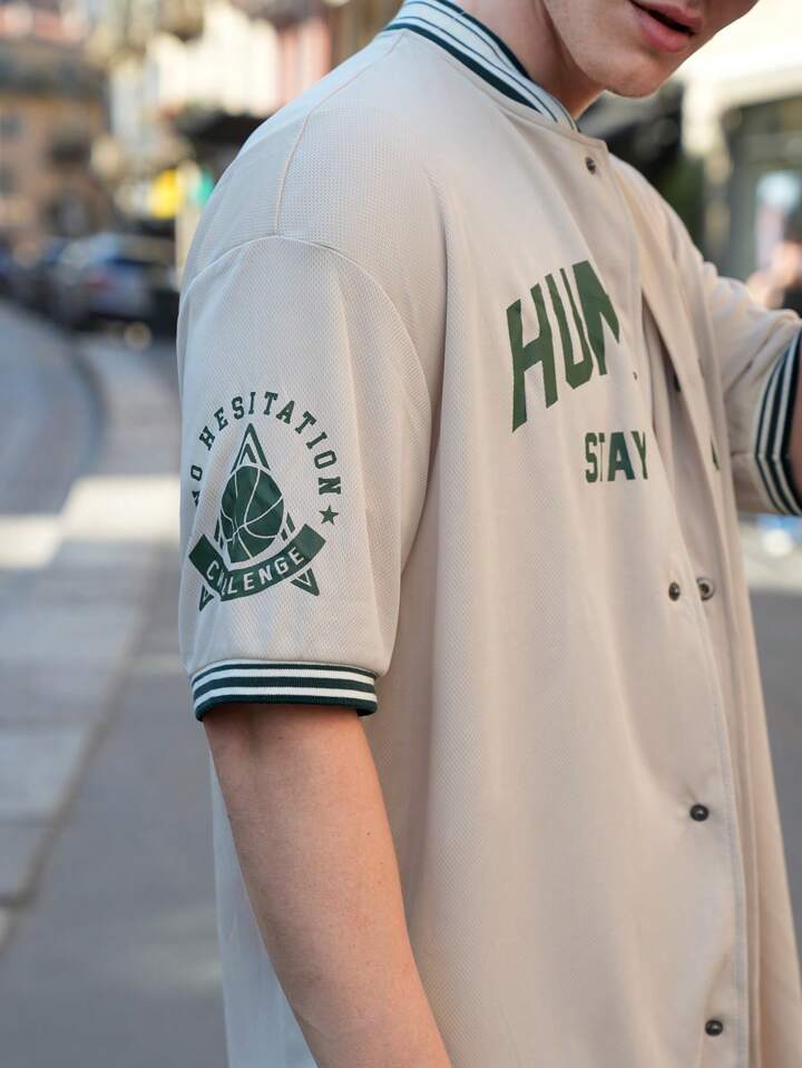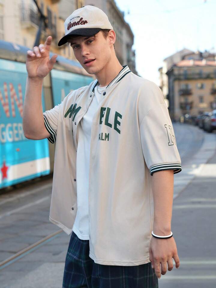 Chemise En Col De Baseball Imprimé Lettre Pour Homme À Coupe Ample Avec Bordure Rayée, Sans T-shirt Inclus