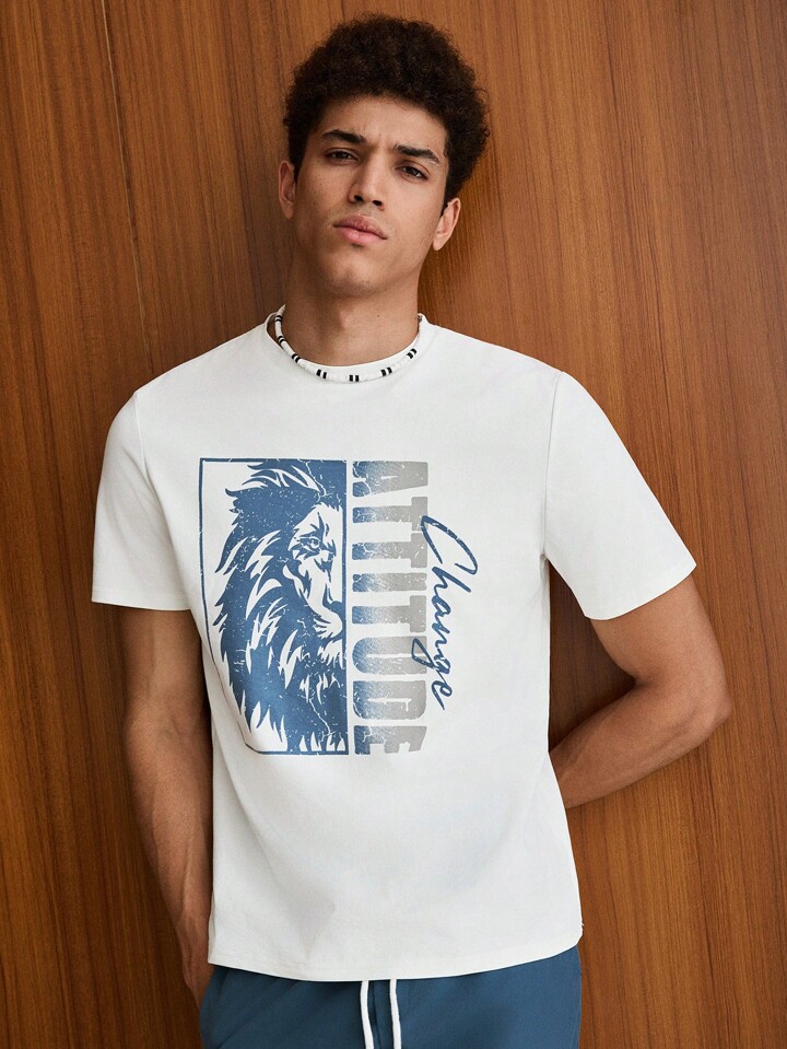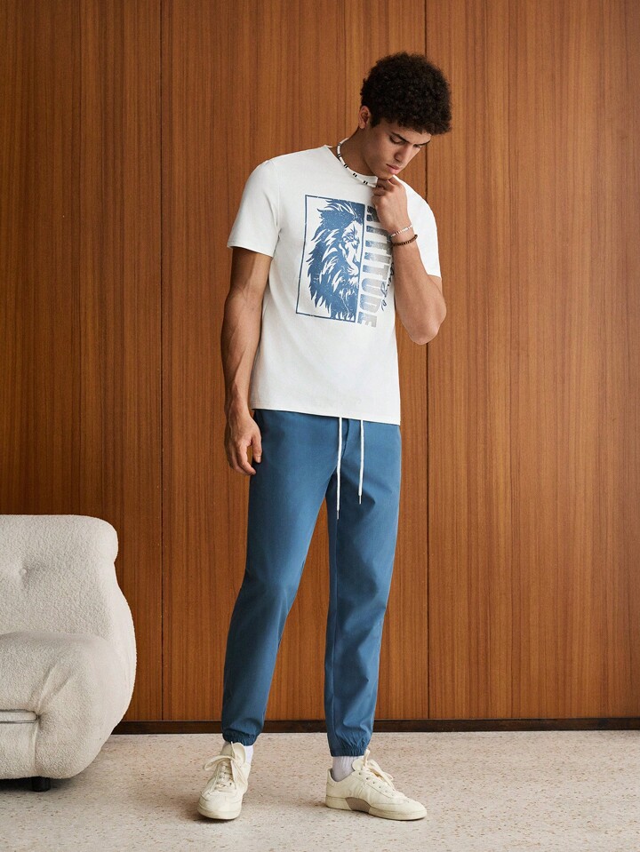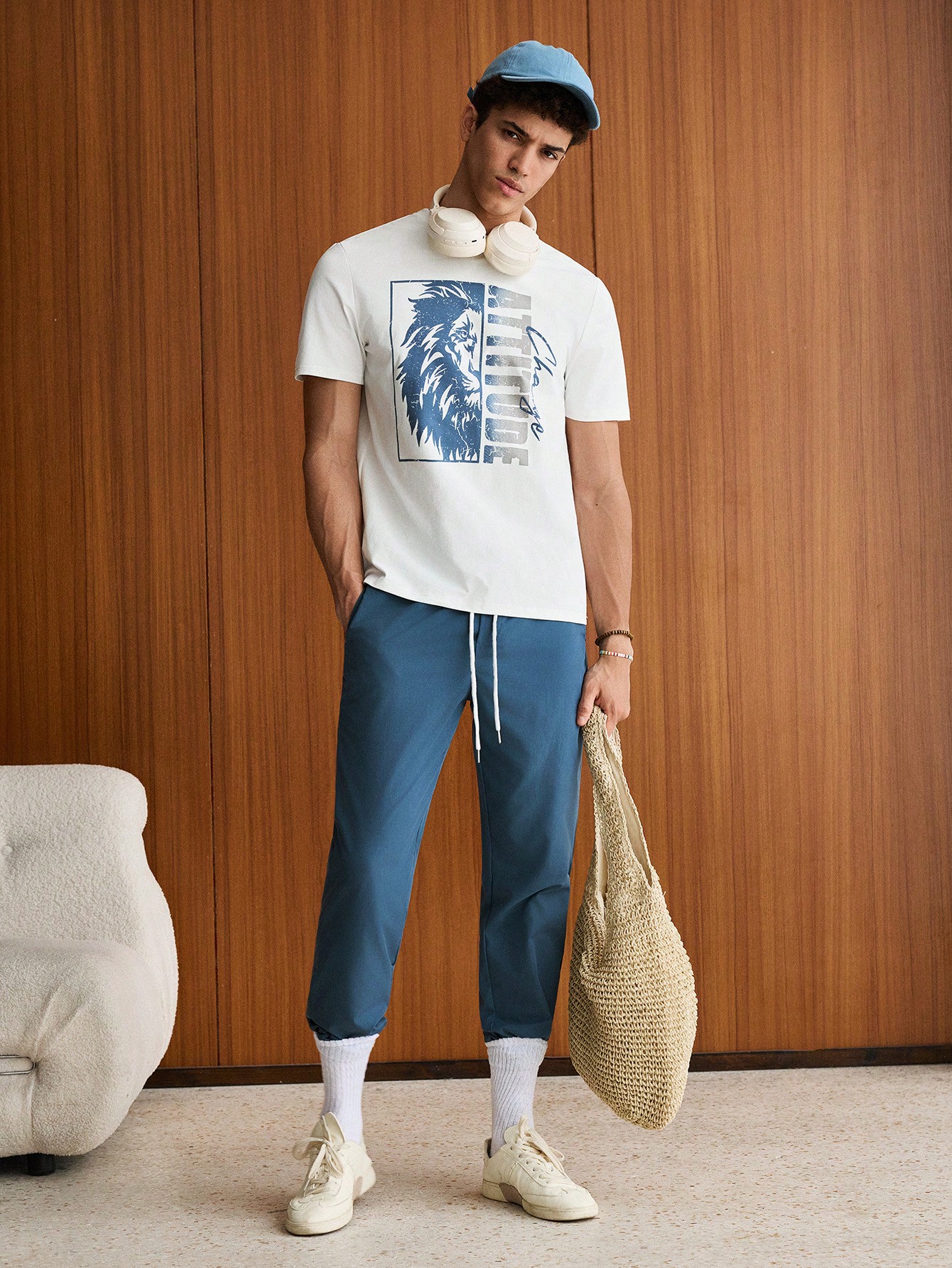 T-shirt casual à manches courtes avec graphique lion et lettre, et pantalon avec cordon de serrage à la taille, colorbloqué, pour amis (hommes)