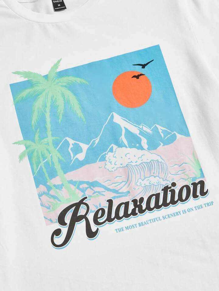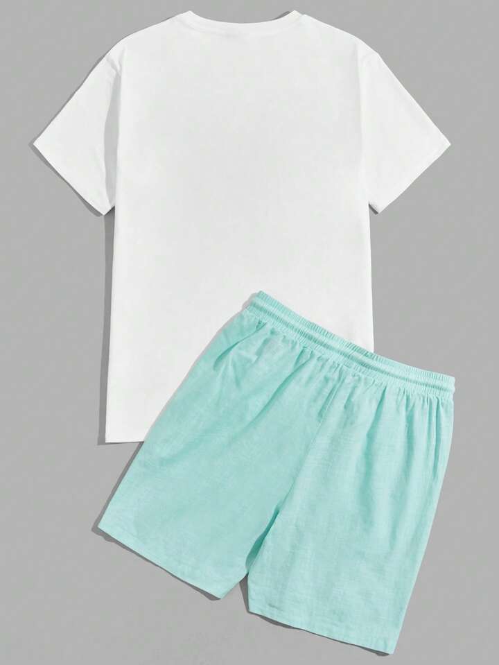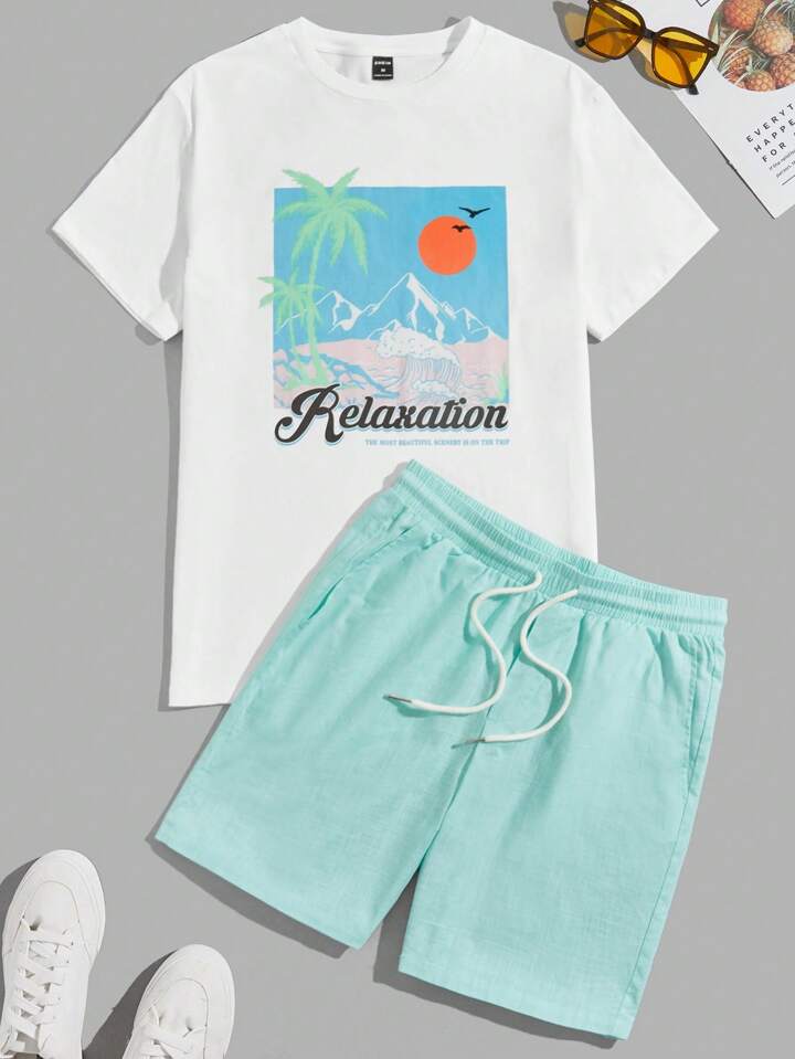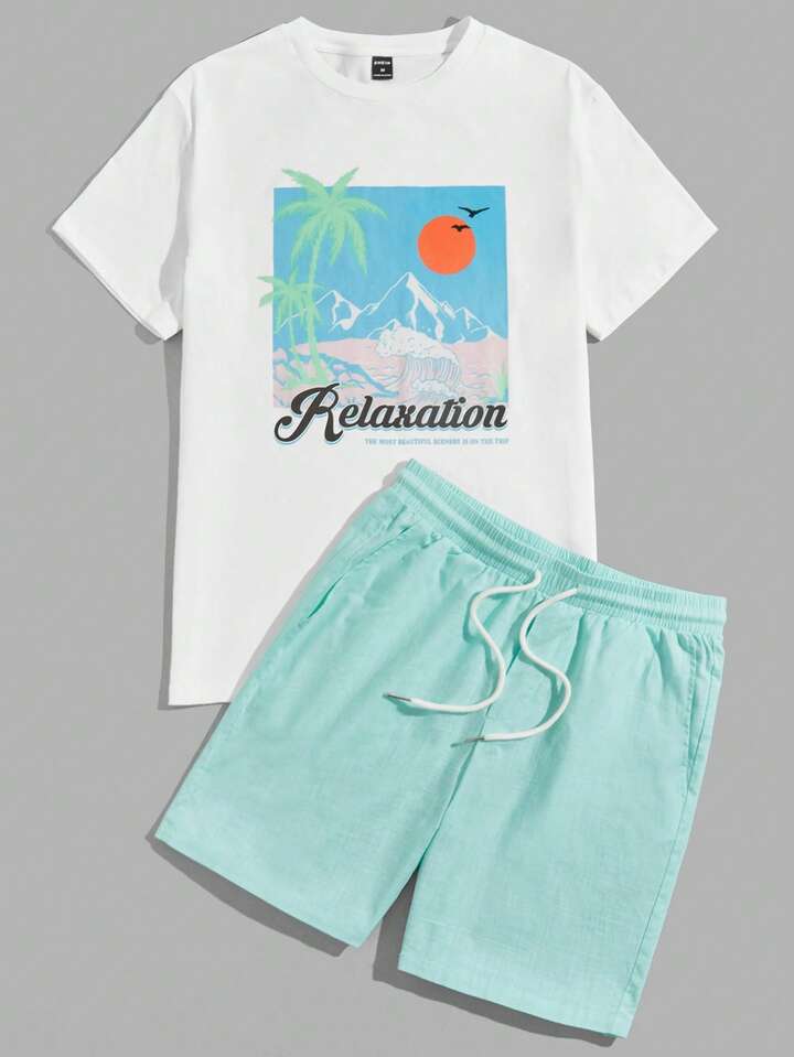 Homme En Coton Imprimé Slogan Et Tropical T-shirt & Short À Cordon