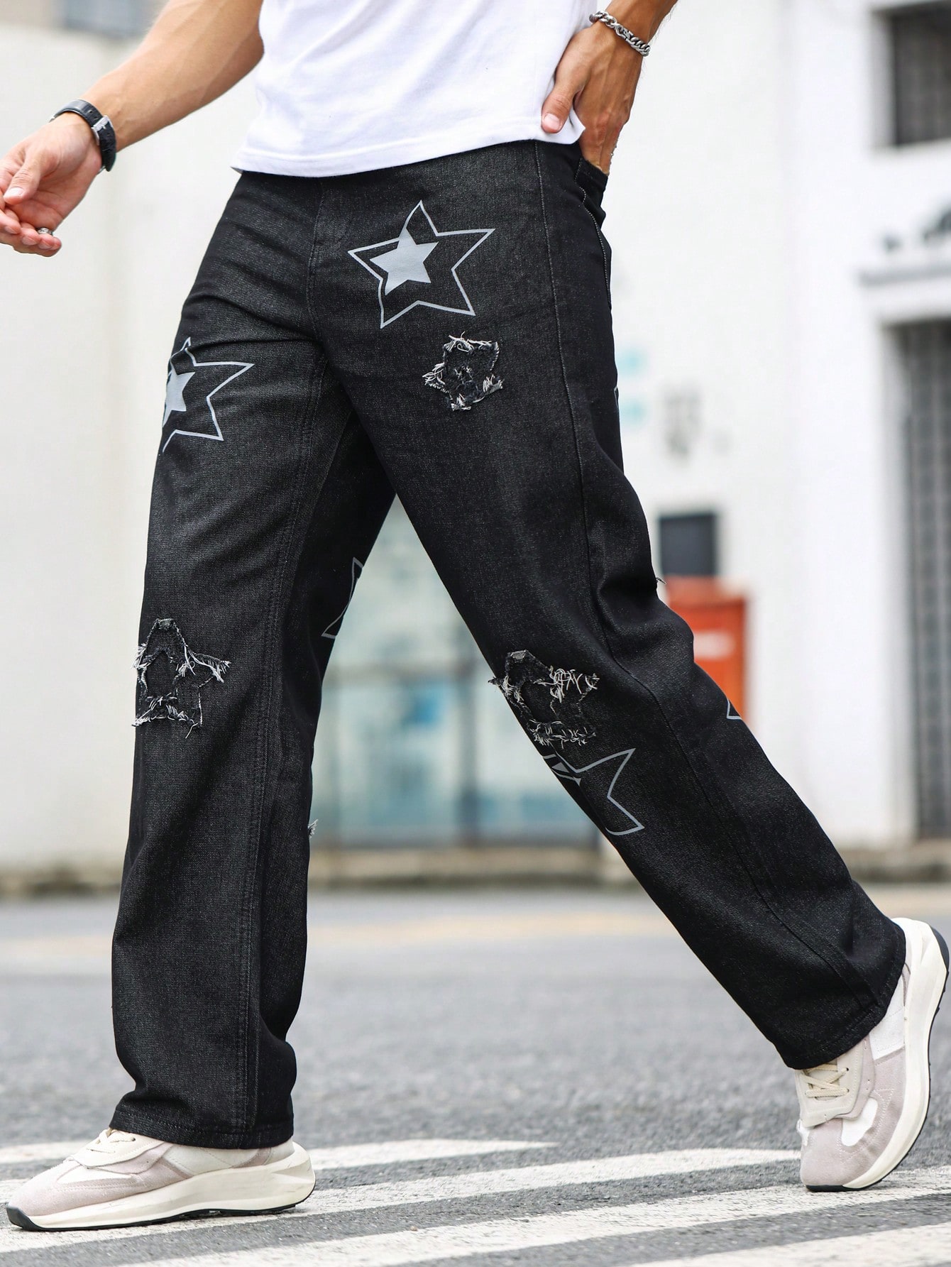 Jean Déchiré Décontracté À Jambe Droite Imprimé D'étoiles Pour Hommes