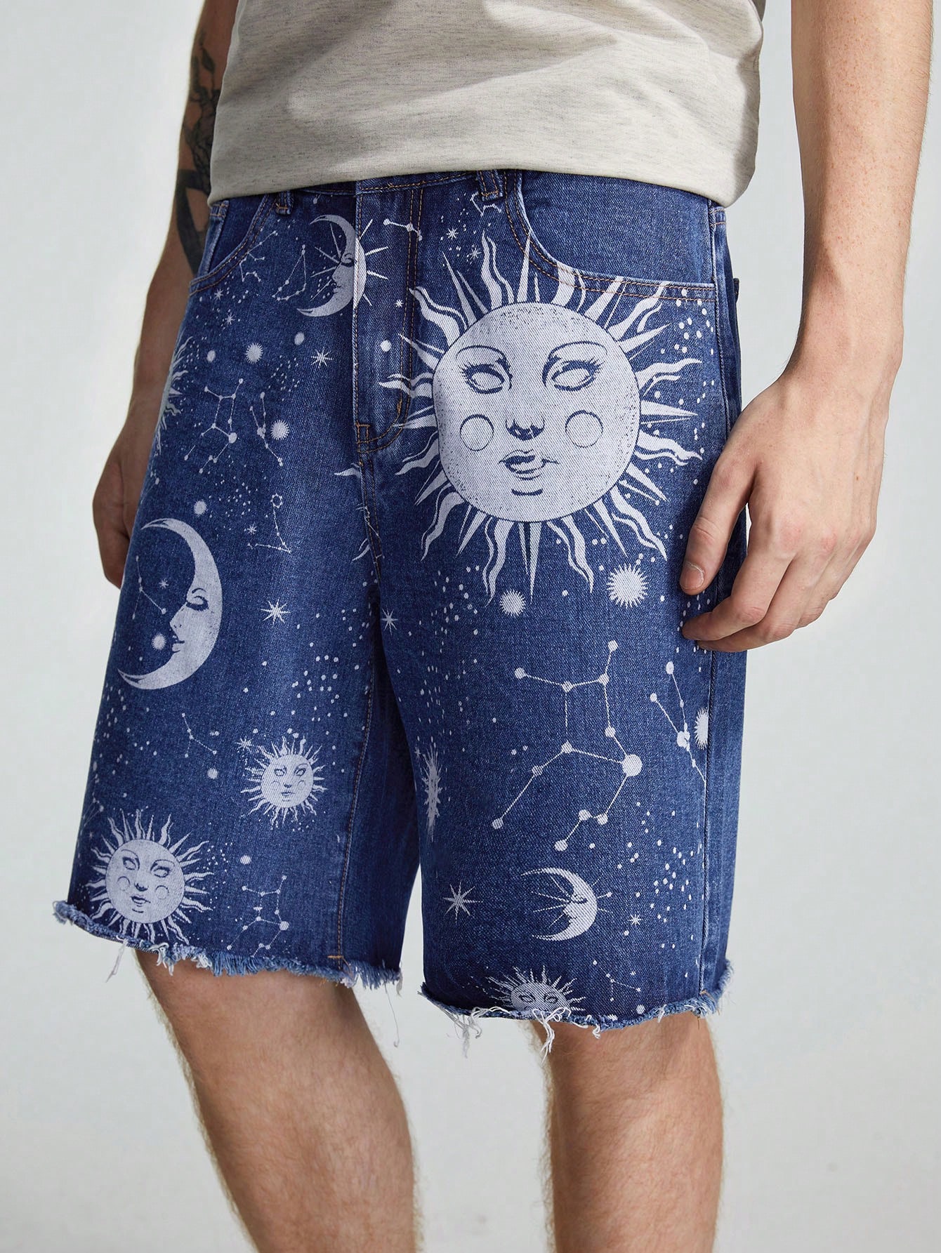 Homme Short En Jean Imprimé Soleil Et Lune À Ourlet Effiloché
