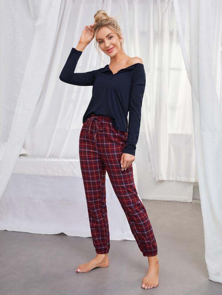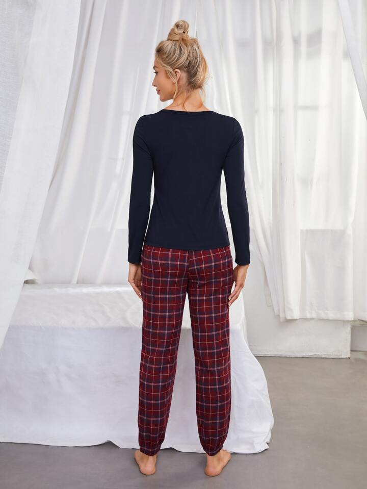 Ensemble de pyjama avec t-shirt à demi-boutons et pantalon à imprimé à carreaux
