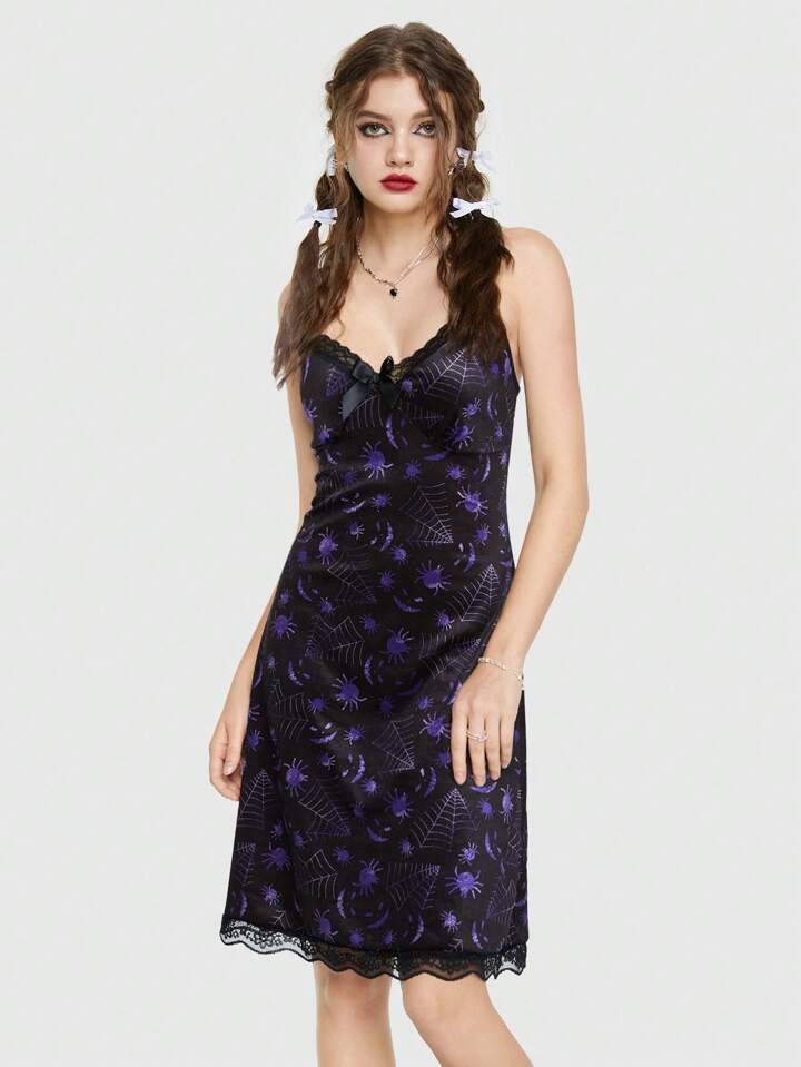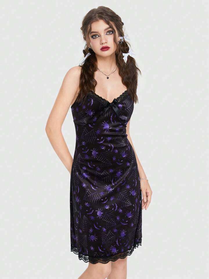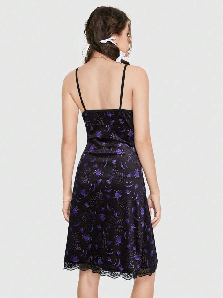 Robe De Nuit À Fines Brides Imprimé Halloween En Dentelle